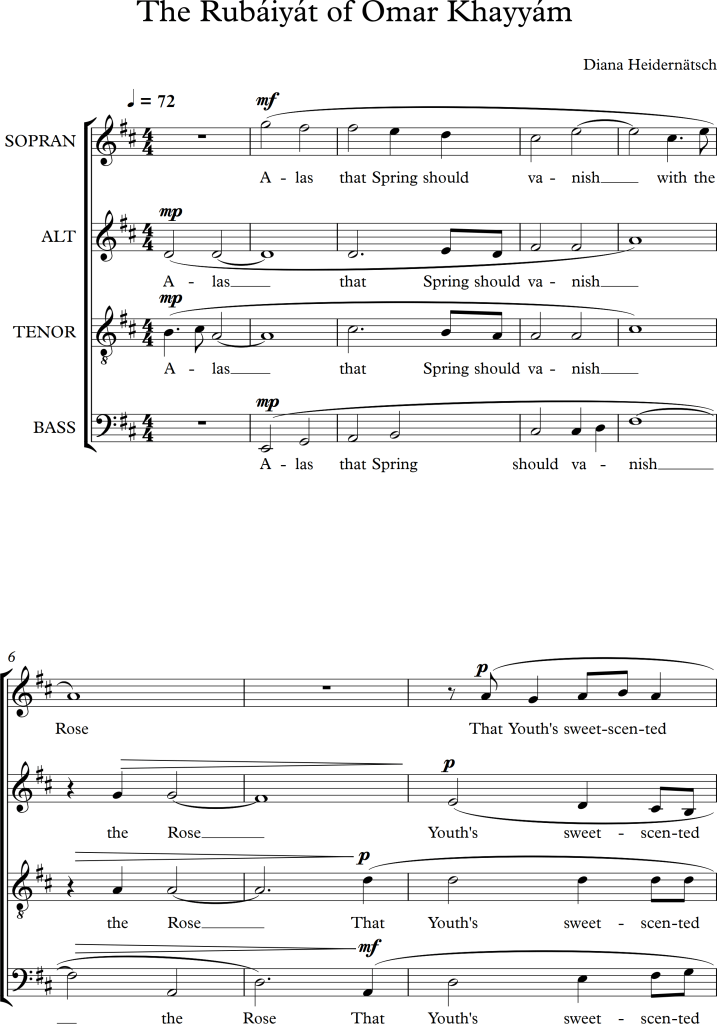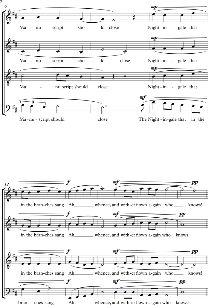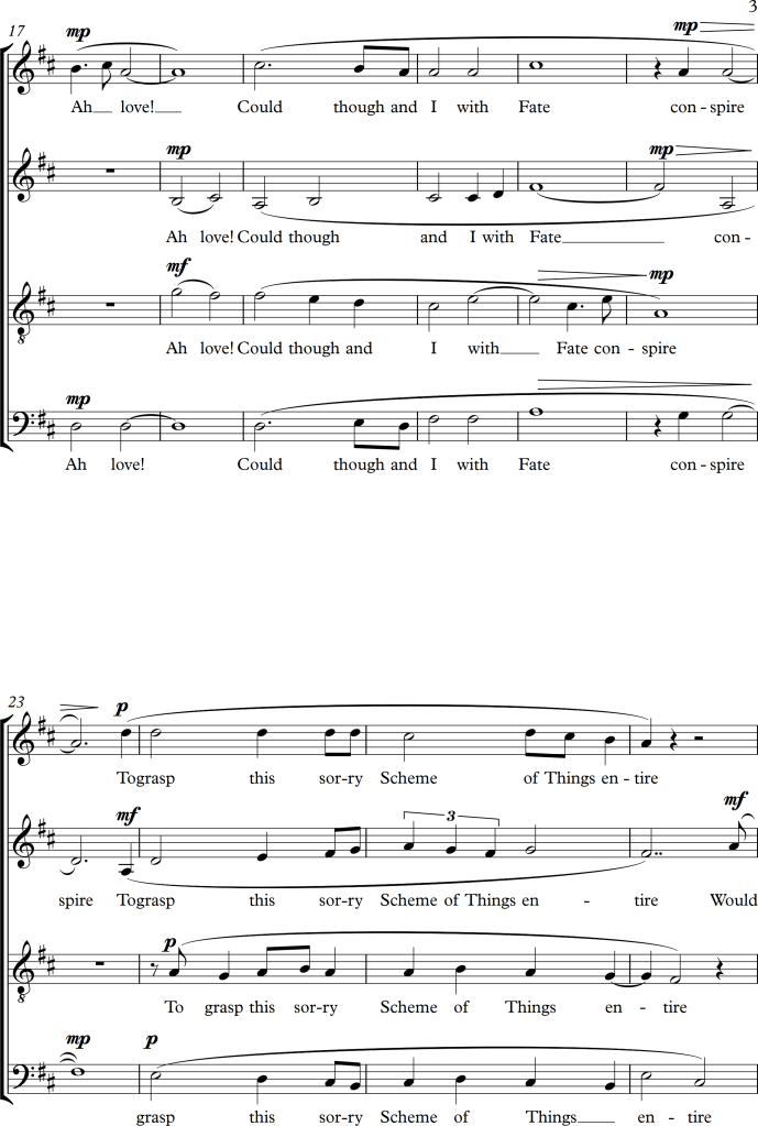 The task for this Assignment was to create a Madrigal for a mixed choir. I chose the first text from my study folder, as it was the longest one and I wanted to work on something more challenging where I could use the skills I gained over the last course unit. The arrangement of the text, and especially the fact, that each line has 10 syllables, made it easier to reuse musical material. As I didn’t want the piece to be too repetitive either, I parted the text in half and reused musical material at the start of the fourth line. Furthermore, to keep it interesting for the performers I also switched the voices around. For the first part, the soprano and bass have the leading voice, which I left to the Alto and Tenors for the second half. Within the last four bars of each phrase all voices become equally important.