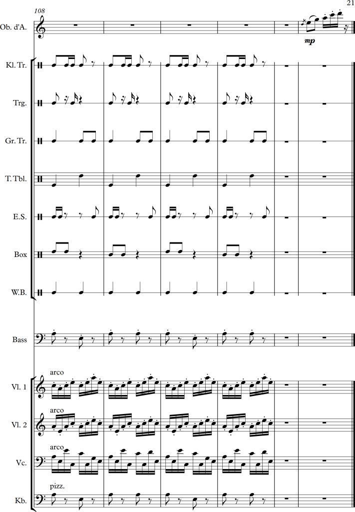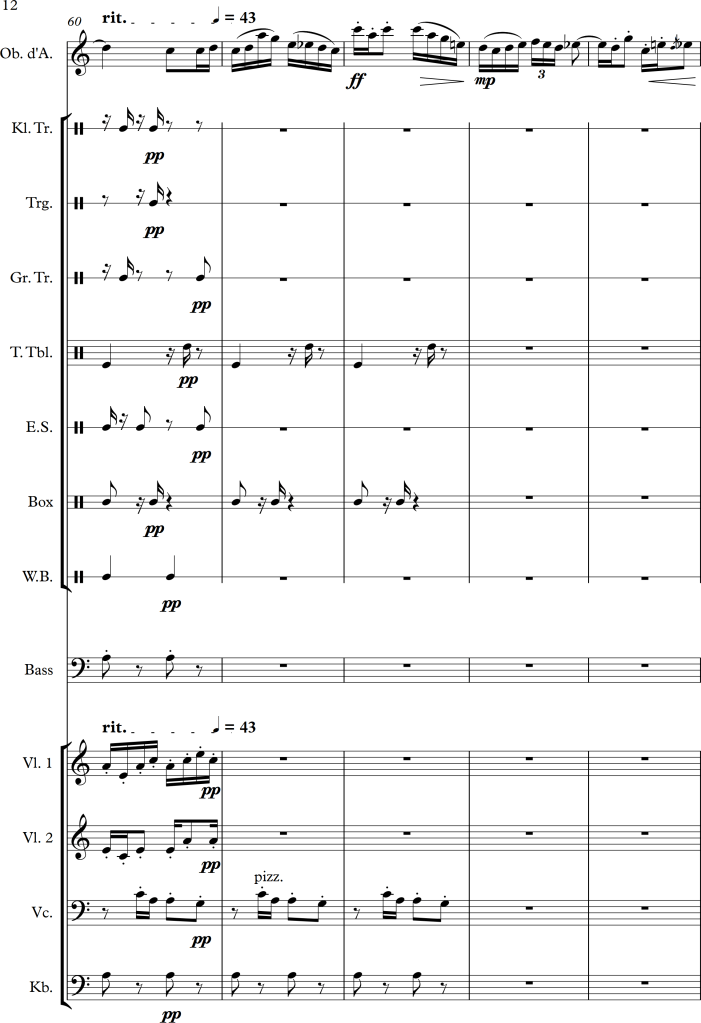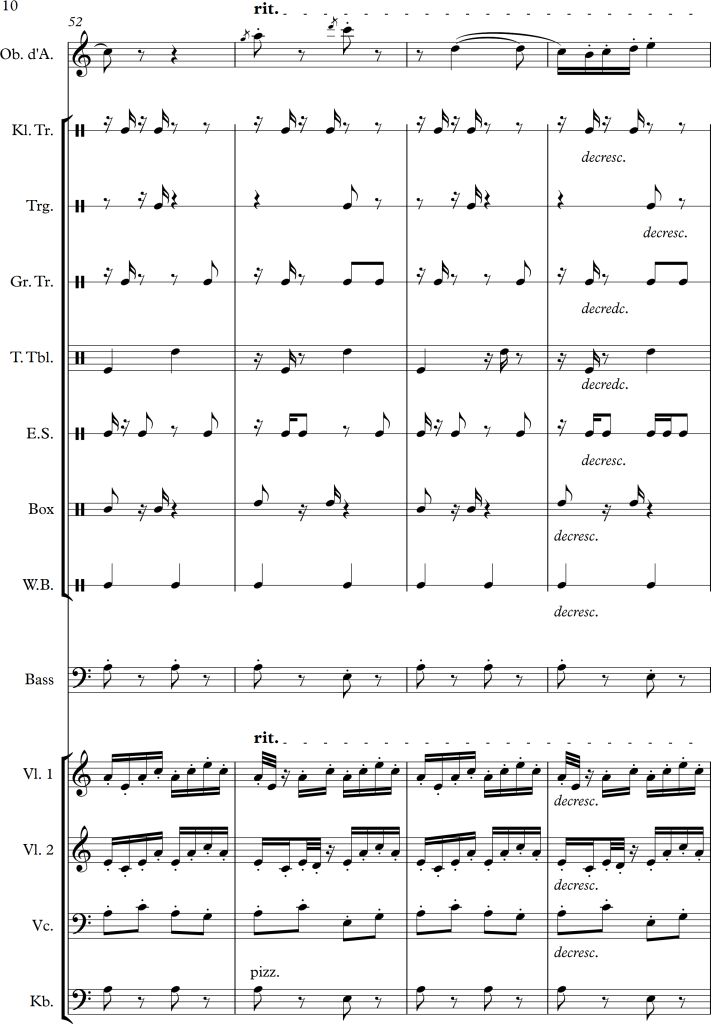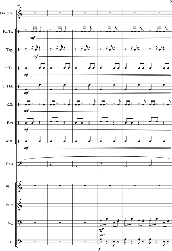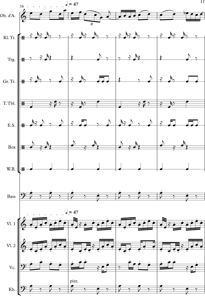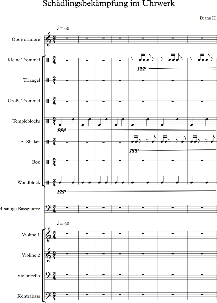 Using a slightly larger ensemble, I tried to create a piece, which covers a repetitive pattern, symbolizing a clock. This theme is then put against an “intruder” (in this case the oboe), which moves more independently, and slowly seems to interfere with the forward moving rhythm of the other instruments.