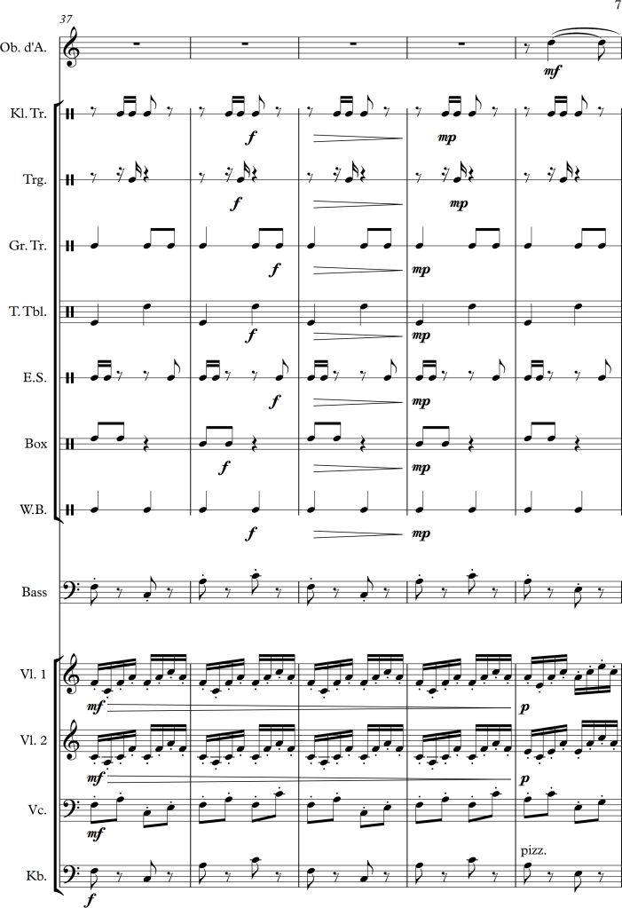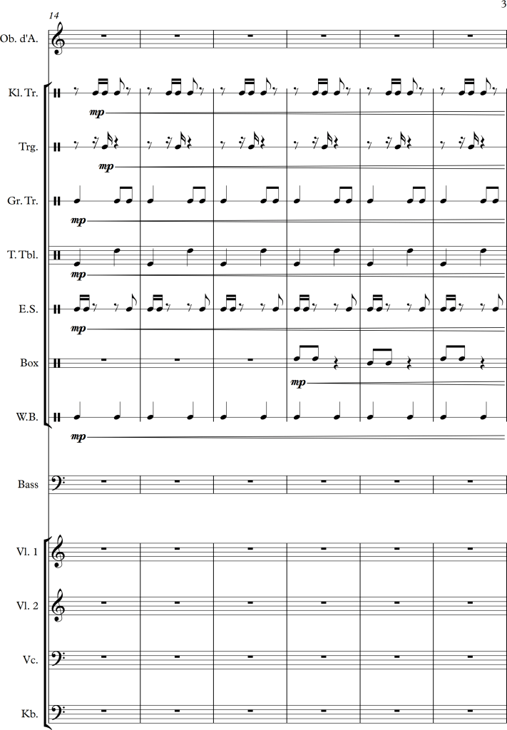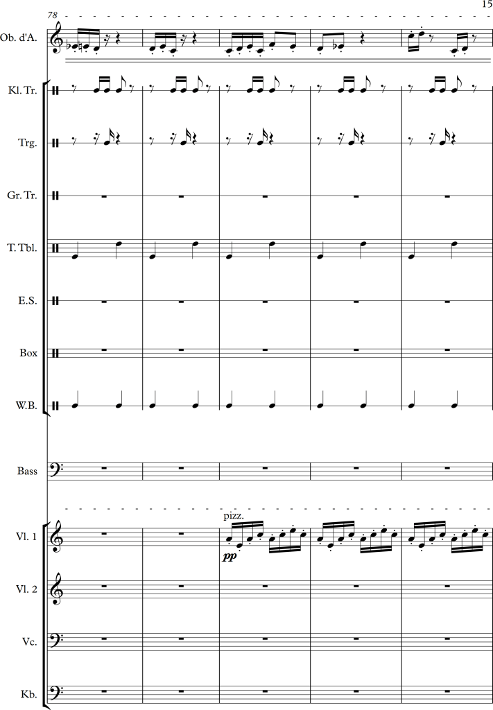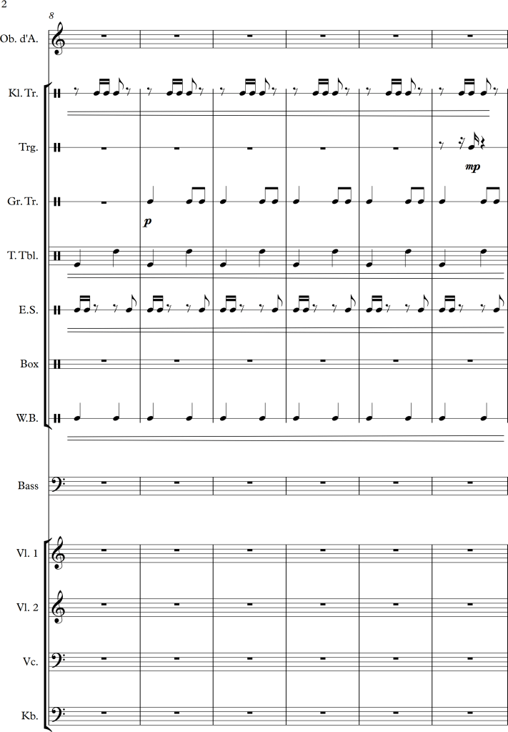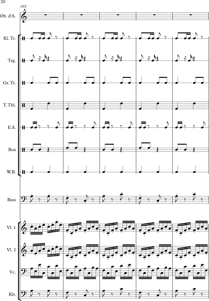 Using a slightly larger ensemble, I tried to create a piece, which covers a repetitive pattern, symbolizing a clock. This theme is then put against an “intruder” (in this case the oboe), which moves more independently, and slowly seems to interfere with the forward moving rhythm of the other instruments.