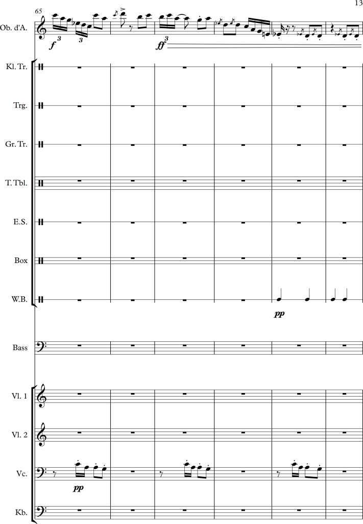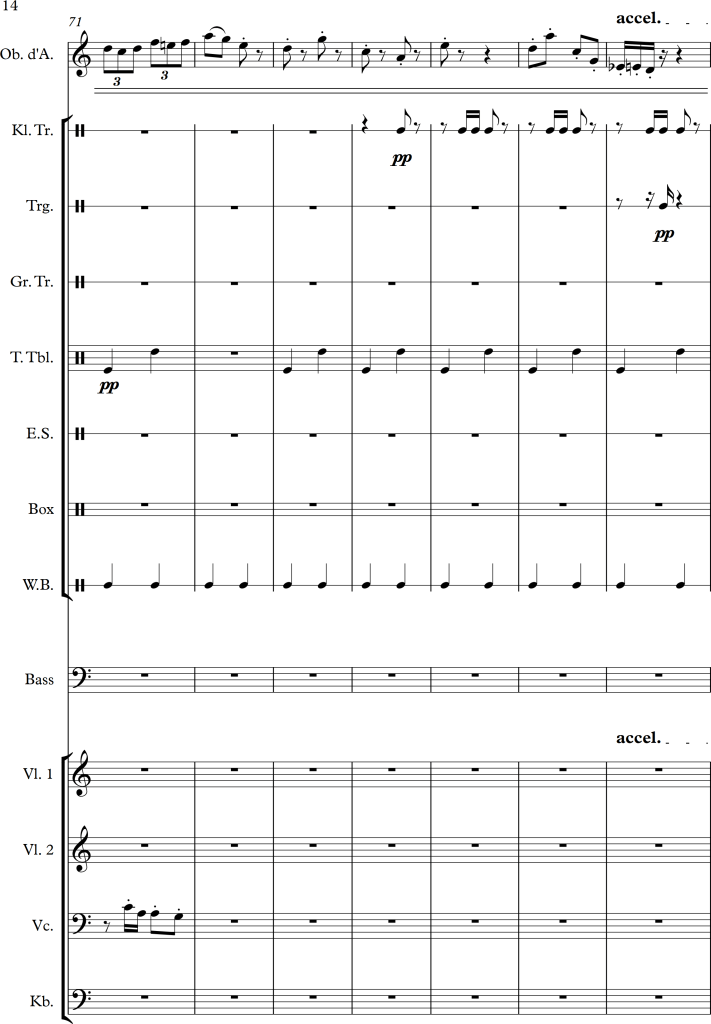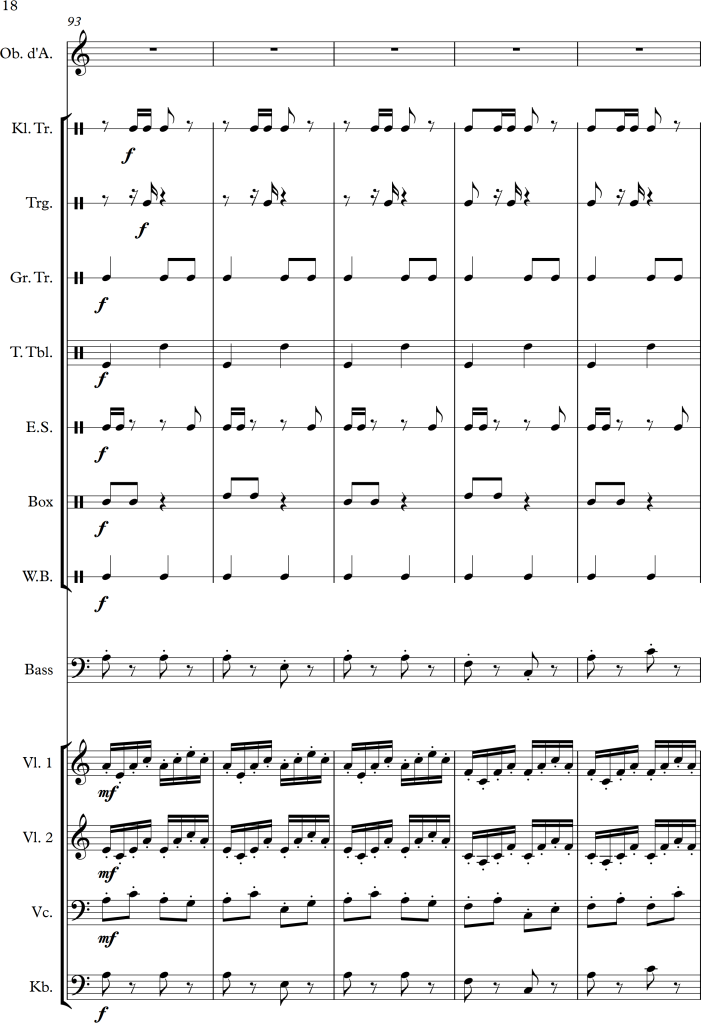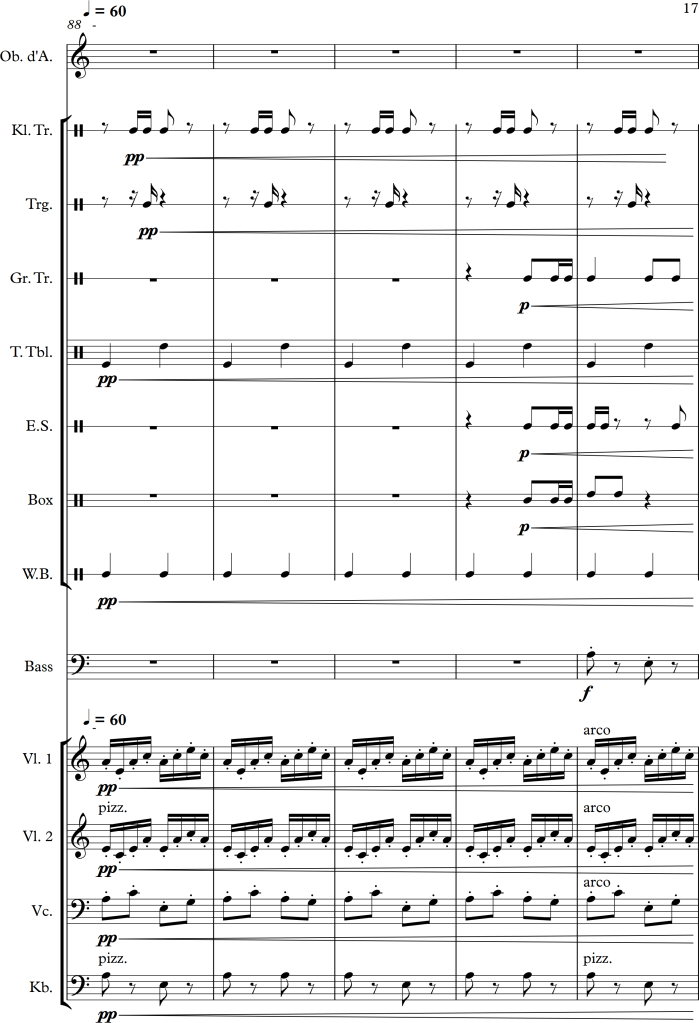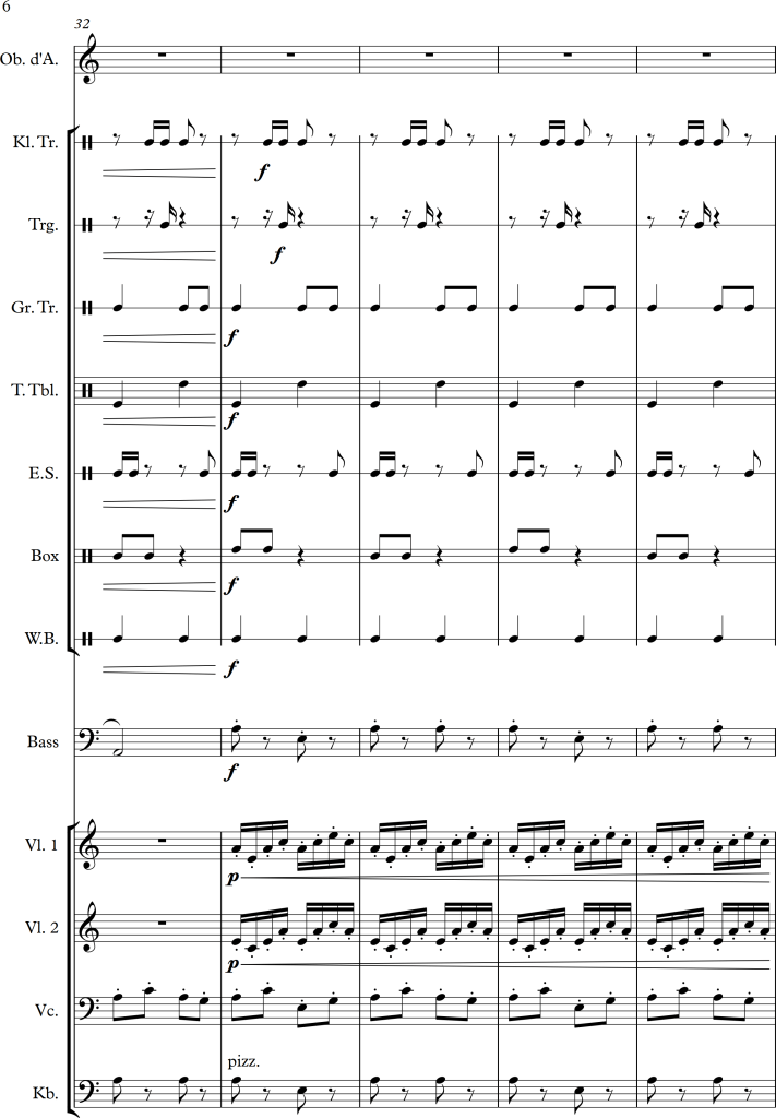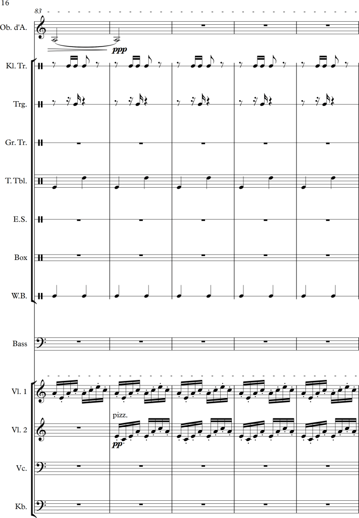 Using a slightly larger ensemble, I tried to create a piece, which covers a repetitive pattern, symbolizing a clock. This theme is then put against an “intruder” (in this case the oboe), which moves more independently, and slowly seems to interfere with the forward moving rhythm of the other instruments.