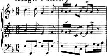Nonetheless, as the sound of the traverso and viola instruments can get quite piercing in several parts, I personally sometimes had the impression, that this arpeggio movement was almost as dominant as the two main voices. Furthermore, I think that writing it for these two instruments instead of the right hand of the cembalo, was a rather unusual approach which also gives the piece more chances to vary with different strengths of musical colours.