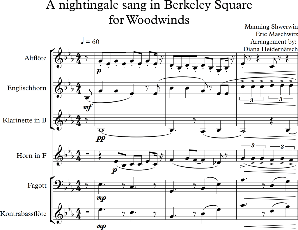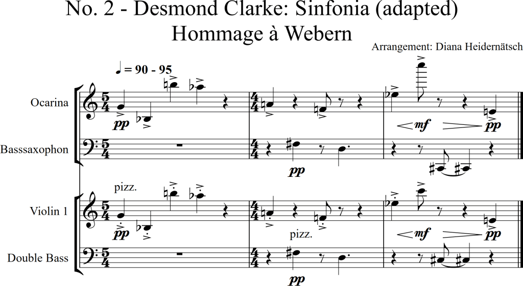 The arrangement of this piece was the most challenging one so far. I often had to rearrange the different phrases according to the range of the instruments. On the other hand, this also caused an equal layout of the phrases and allows the piece to show its character in different ways.