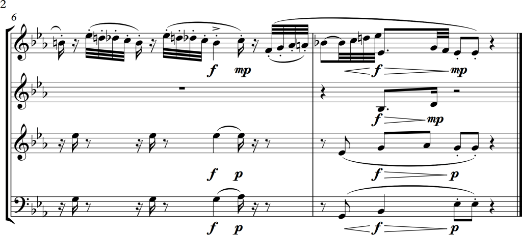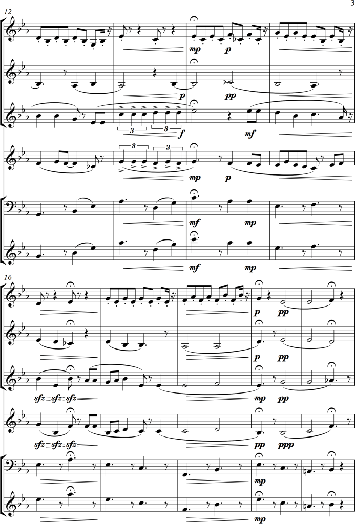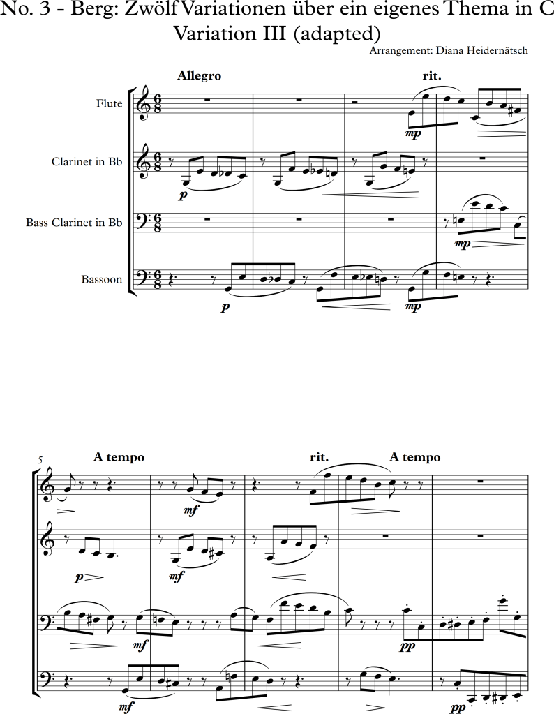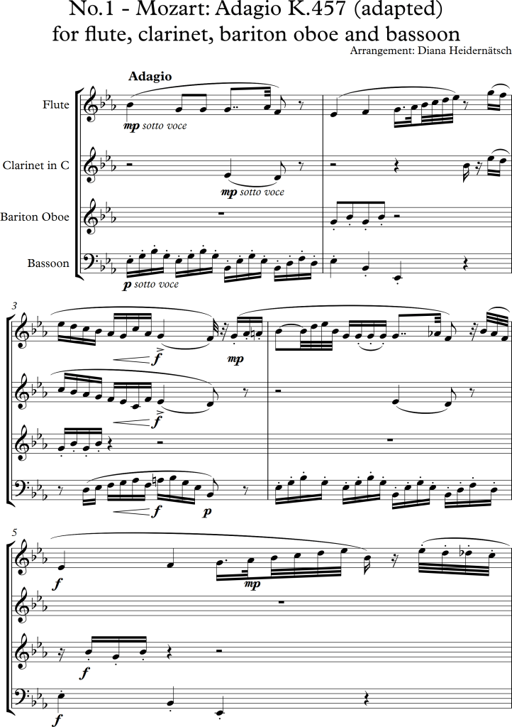 I made the required arrangement for flute, clarinet, baritone oboe and bassoon. The four voices are each represented by one instrument. I furthermore especially tried to emphasize the first and fourth voice as well as the parts with strong dynamical changes.