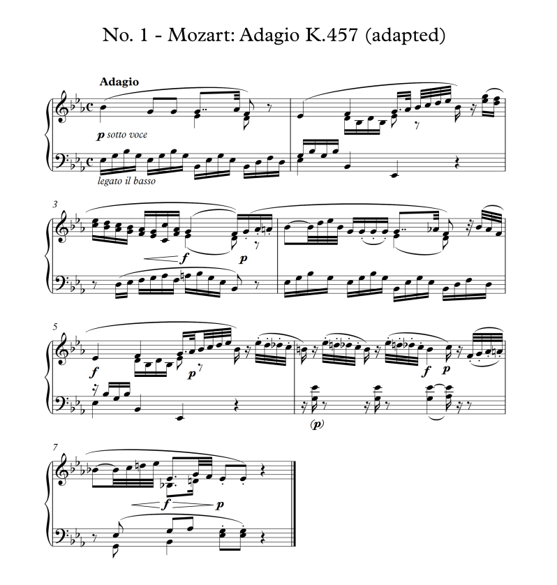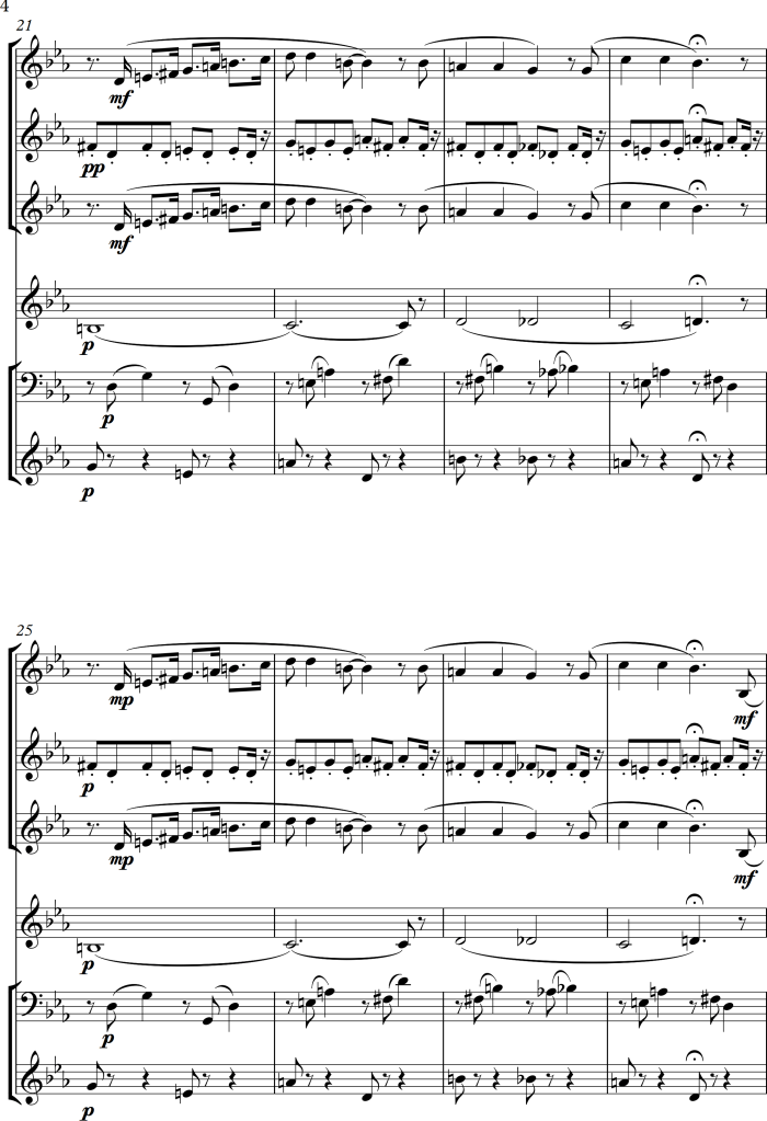 This piece is written in Eb major. Looking at the structure of the piece, one can part it into two halfs: Part one covers bars 1 – 3, and Part 2 bars 4 – 7. Whilst the melodic idea as well as the accompaniment is introduced in part 1, it is repeated in a slightly more virtuously way within part 2. The second part also has an additional ending bar.It has 4 voices, whist the second and third voice are rarely used. The melody line is always the first voice, played by the right hand. Apart from the bass voice, there are barely any jumps. Furthermore, the lowest voice works mainly with I and V chords, often laid out in arpeggios. In term of the dynamics, there are two peak points going from piano directly to forte.