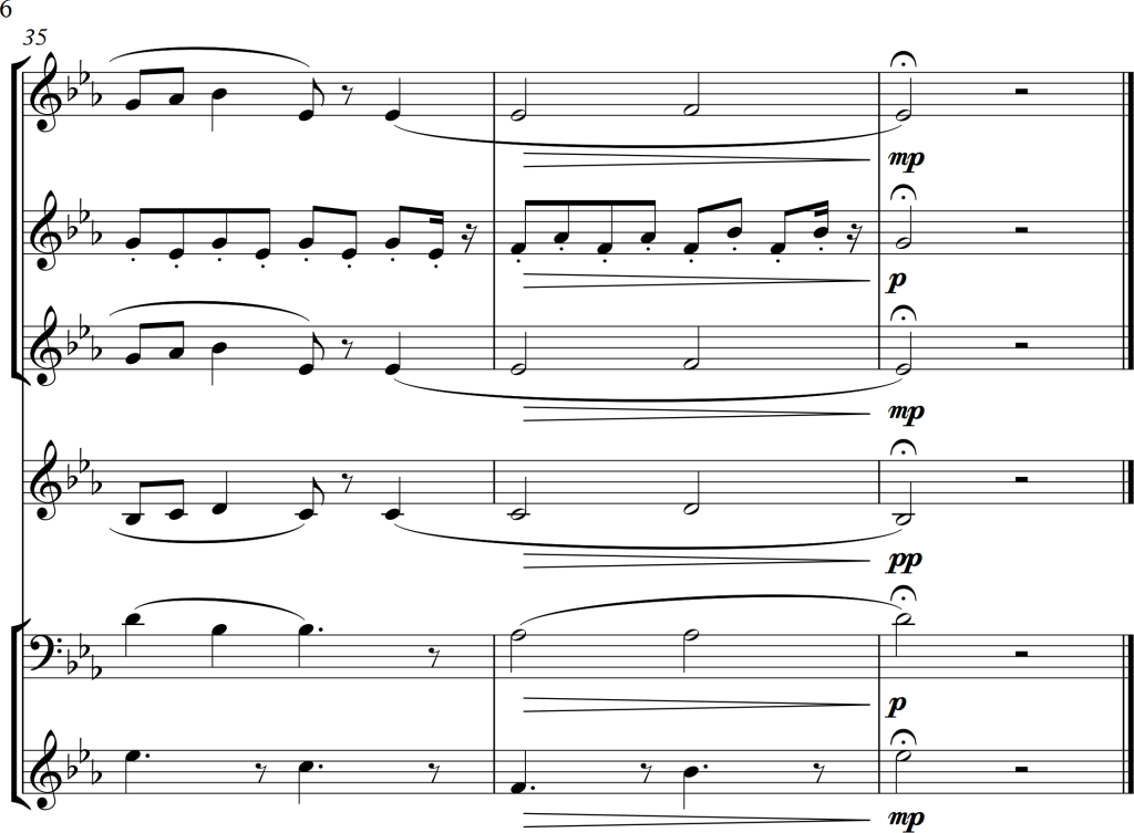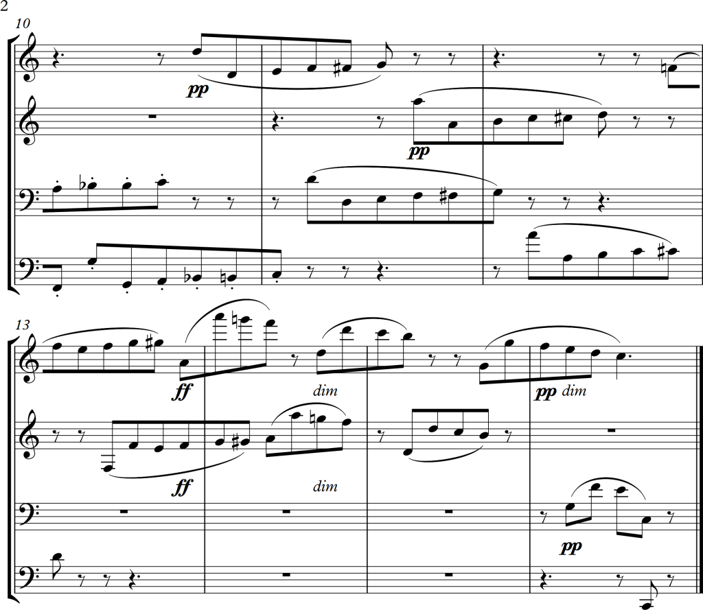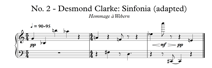 This short piece is written in the style of Serialism, which allows all 12 notes just to be played once. Overall, it is kept really quiet with a pp apart from a short crescendo and decrescendo moving towards and away from the high C played in mf. Interestingly, none of these 12 notes sounds as the same time as the others, they are all played separately. After bar 1, the time signature changes fro 5/4 to 4/4.