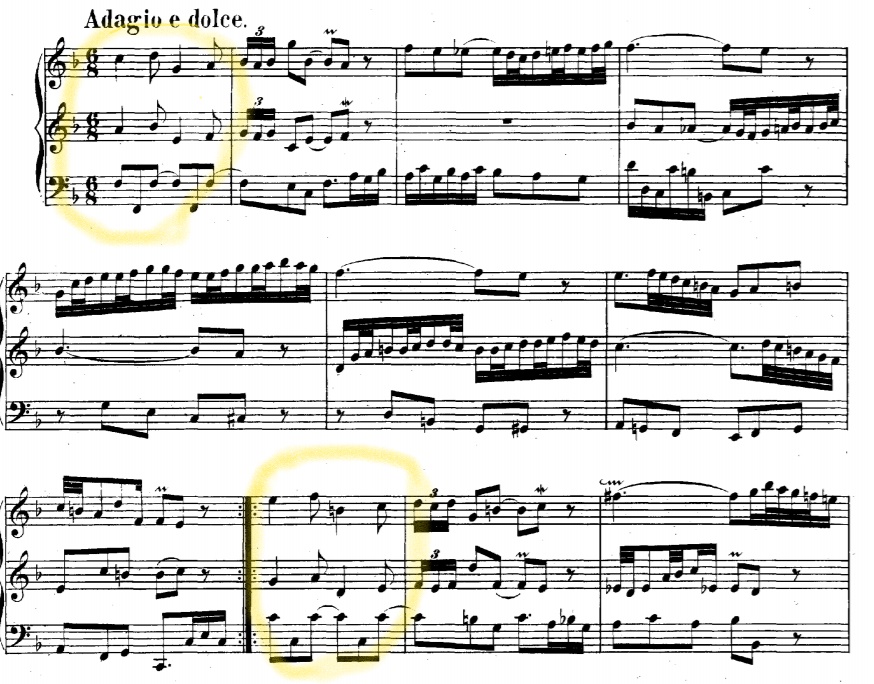 I decided to take a closer look at Bach’s Organ Sonata in d – minor, 2nd movement, BWV 527in comparison to the later developedtriple concerto for traverso, violin, harpsichord and string orchestra, 2nd movement. Within the following paragraphs I will refer to the earlier version for Organ as B527 and the one for traverso, violin and cembalo as B1044.
