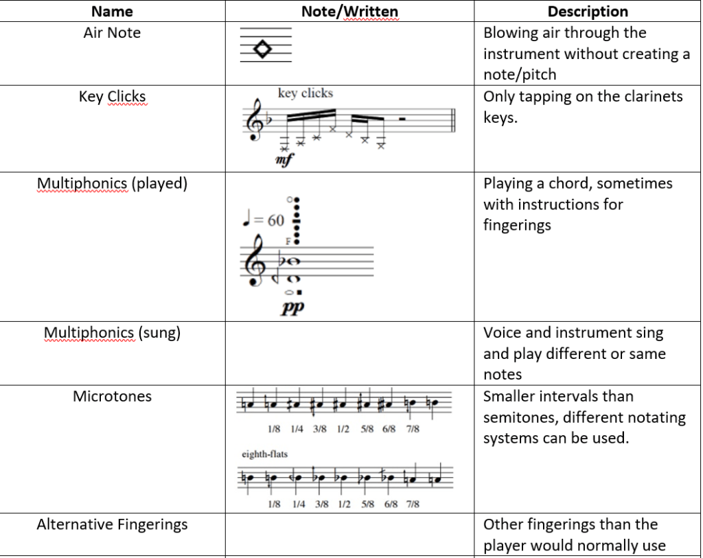 Within research point 2A, I already wrote down some of the “common” techniques a clarinet, or its family can produce, the table below shows some of the less common ones that I was able to find: