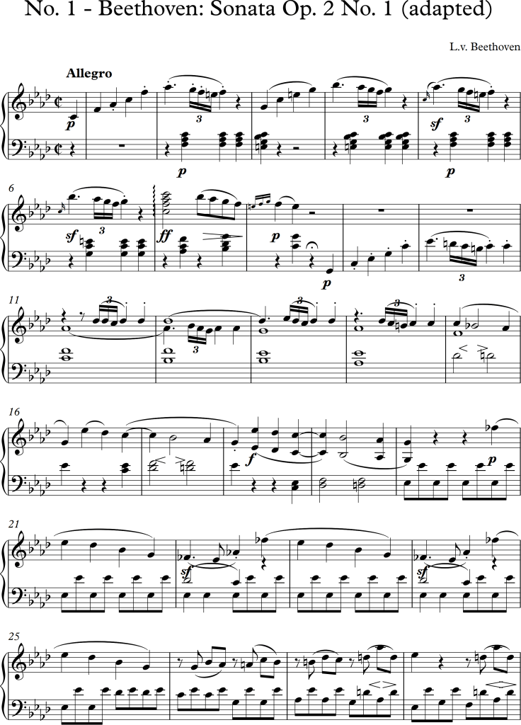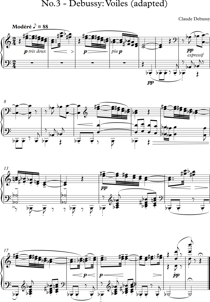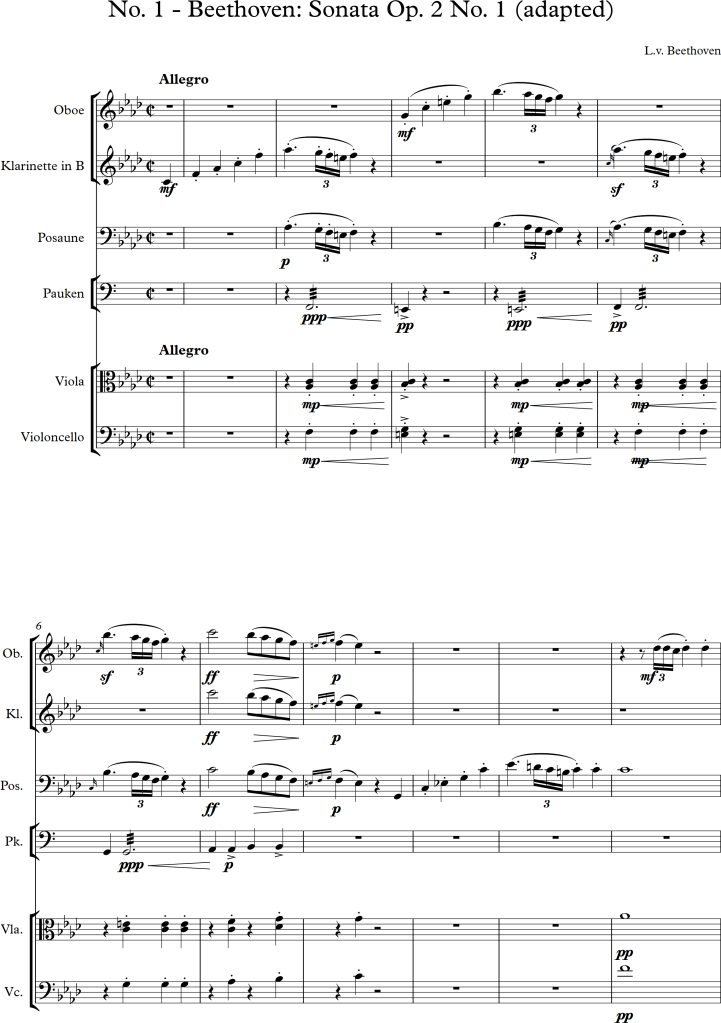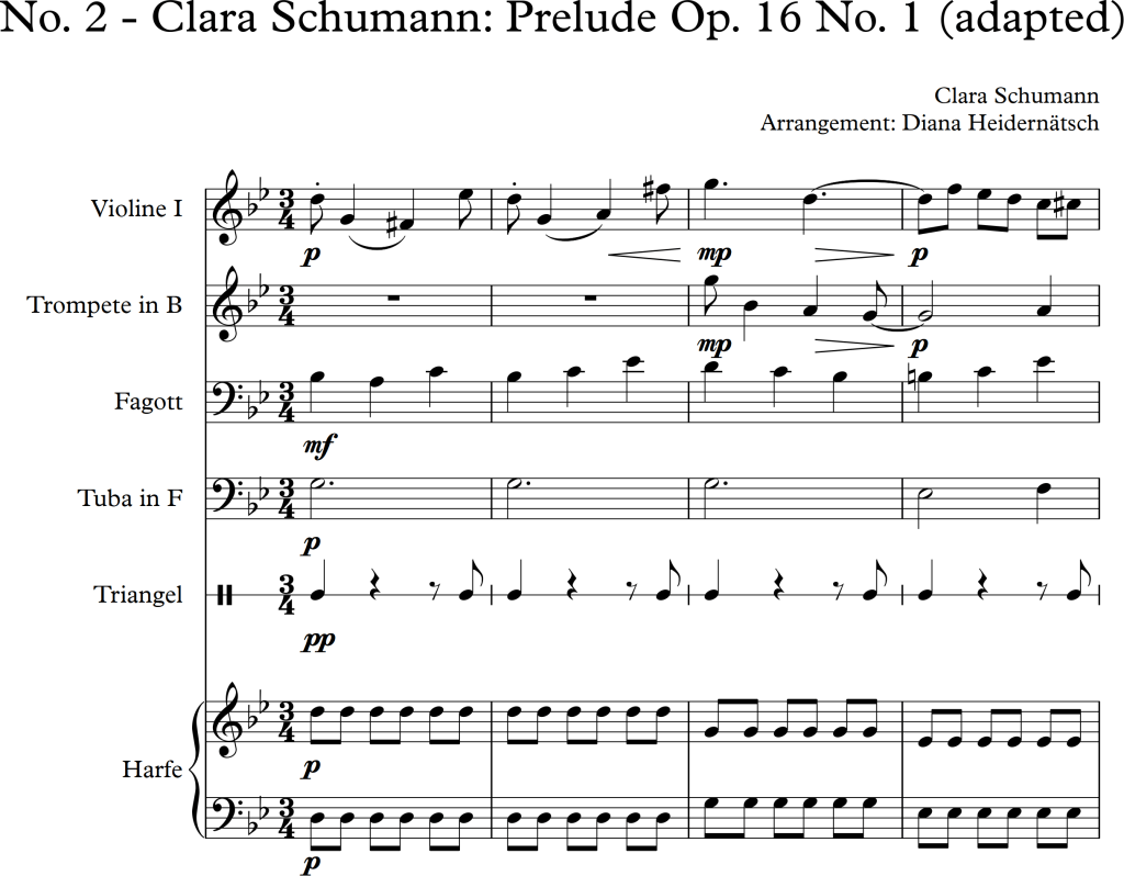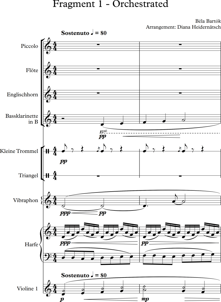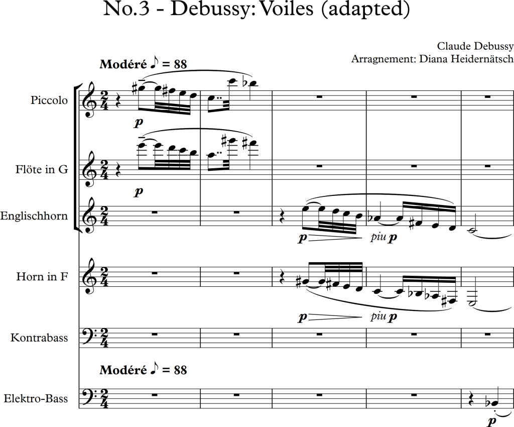 I was asked to arrange the following three pieces for different types of ensembles/orchestras. Knowing that I found it difficult to change some original voices whilst rearranging pieces, I tried to add another feature to each piece. I am aware, that I only chose small ensembles for each piece, although, I felt the amount of instruments was appropriate to represent the composers’ piano versions.