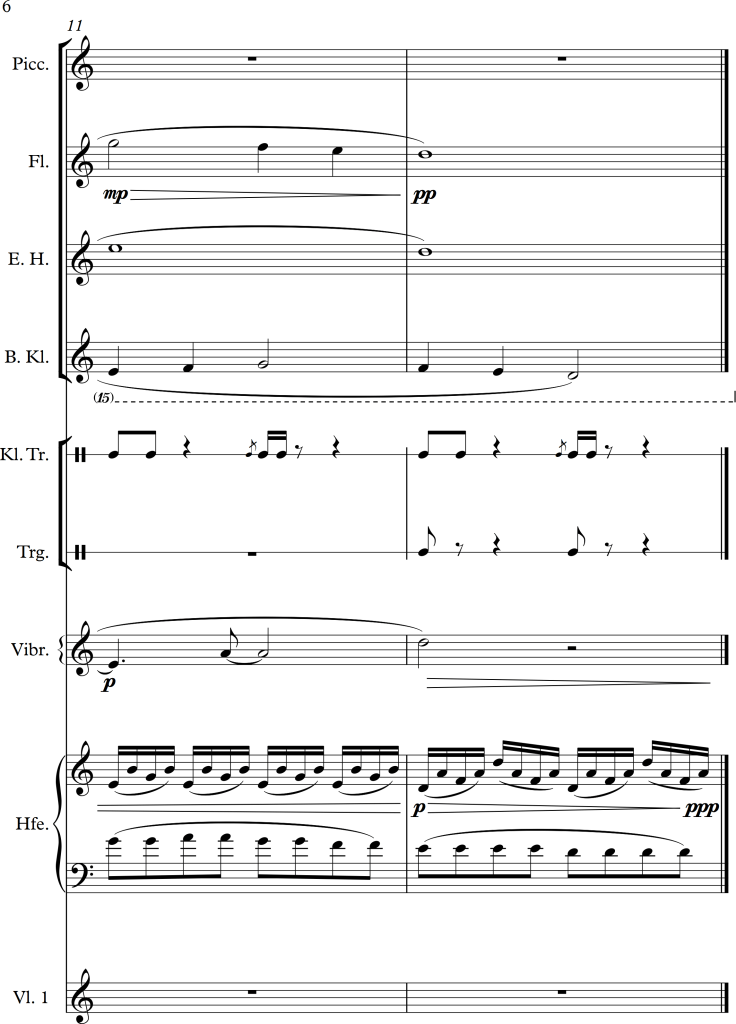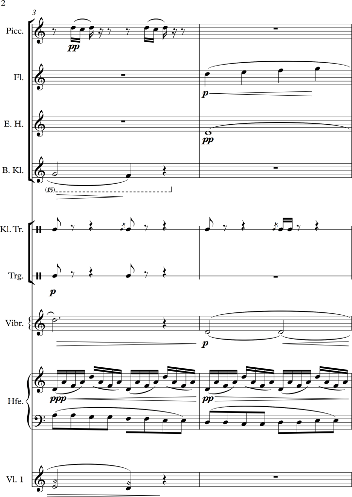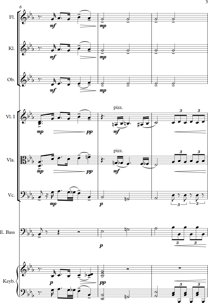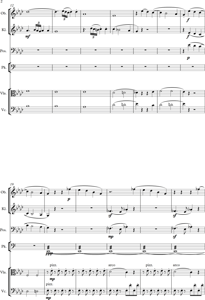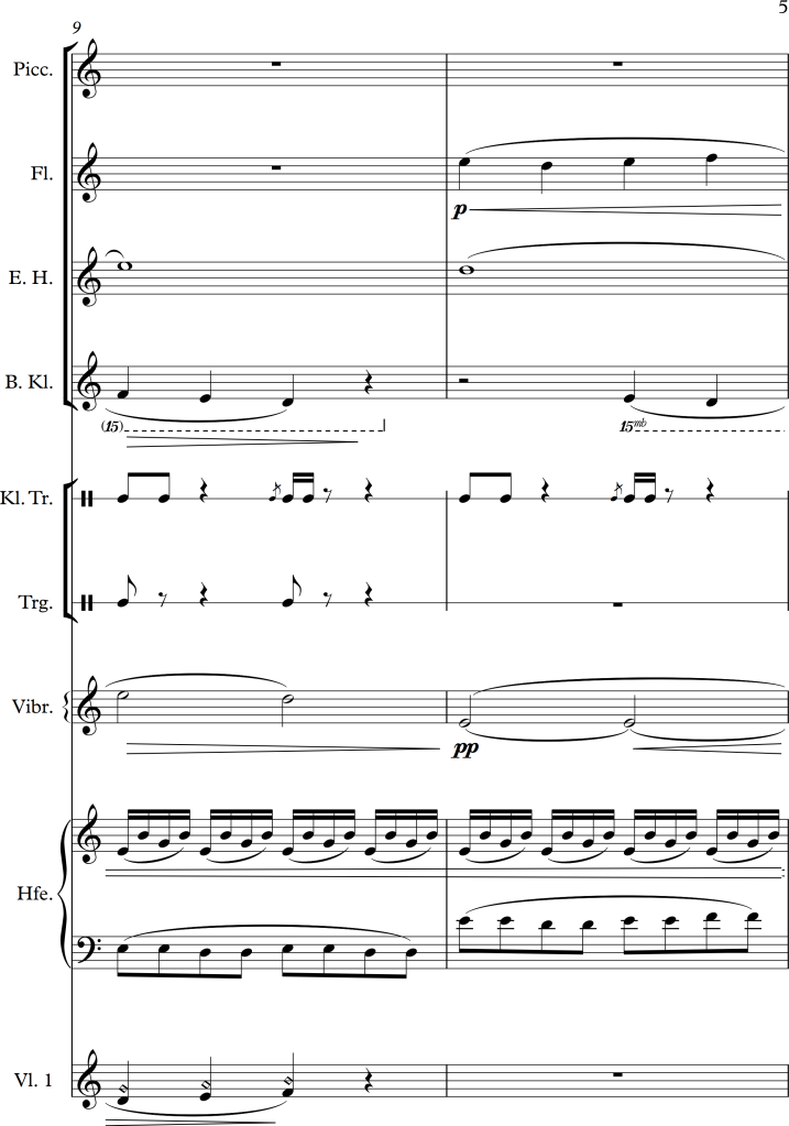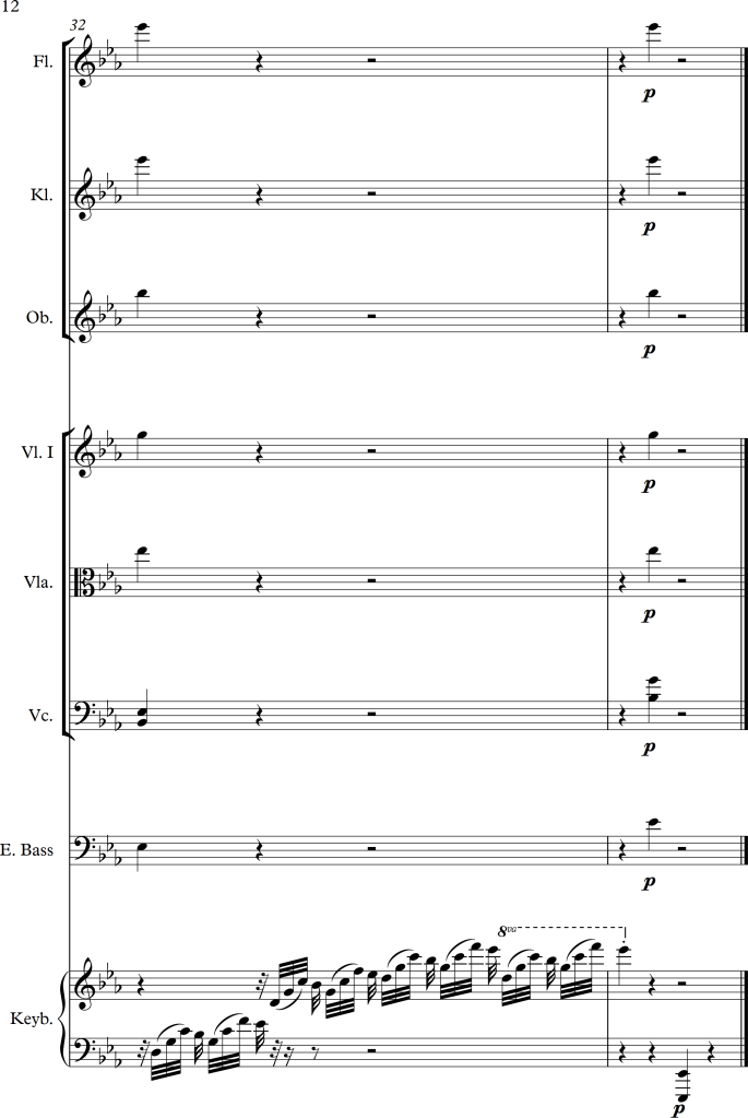 There is a slight change of character between bar 5 and 6, within the piano version it suddenly becomes much lighter, I tried to approach this change by letting all strings play pizzicato for a while. In bar 9, I swapped some of the voices to get some variation for the audience as well as the performers. For the third repetition of the “theme”, I swapped the voices once again, putting the piano in the foreground this time. As the main tune is octaved twice within the original score, I tried to do the same within the different instrumental groups, this in addition to a small alteration of dynamics, allowed the melody to stick out more. Even with these small changes, I wanted the piece to still have a romantic and calm character, which I hopefully managed to maintain.