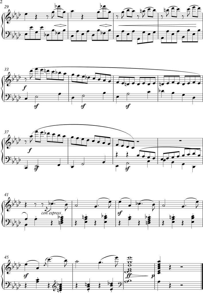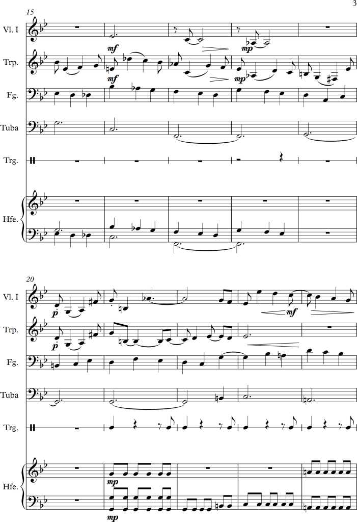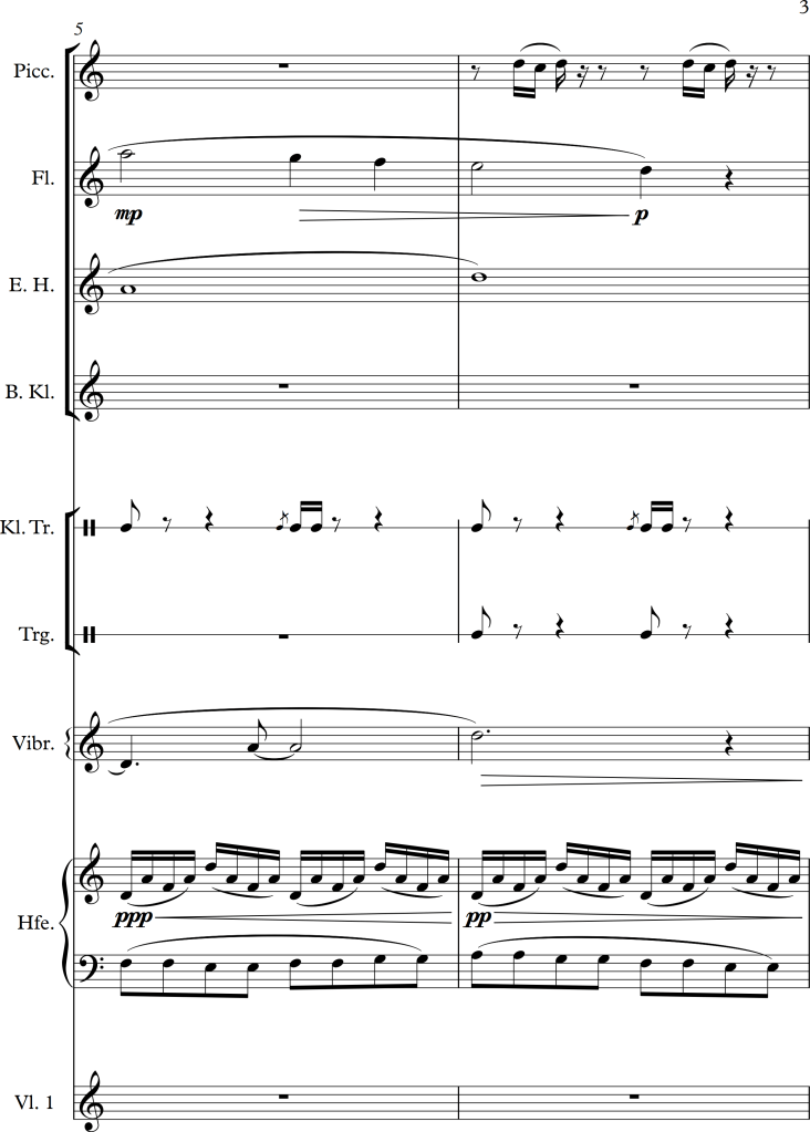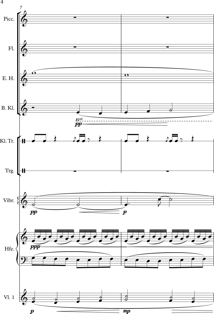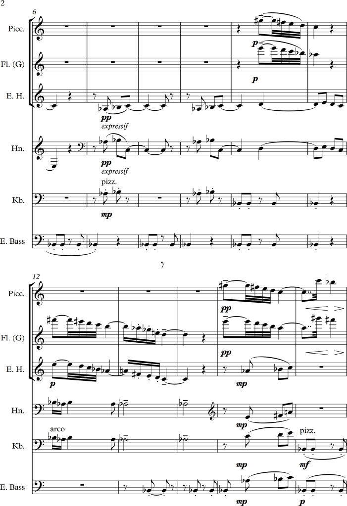There is a slight change of character between bar 5 and 6, within the piano version it suddenly becomes much lighter, I tried to approach this change by letting all strings play pizzicato for a while. In bar 9, I swapped some of the voices to get some variation for the audience as well as the performers. For the third repetition of the “theme”, I swapped the voices once again, putting the piano in the foreground this time. As the main tune is octaved twice within the original score, I tried to do the same within the different instrumental groups, this in addition to a small alteration of dynamics, allowed the melody to stick out more. Even with these small changes, I wanted the piece to still have a romantic and calm character, which I hopefully managed to maintain.