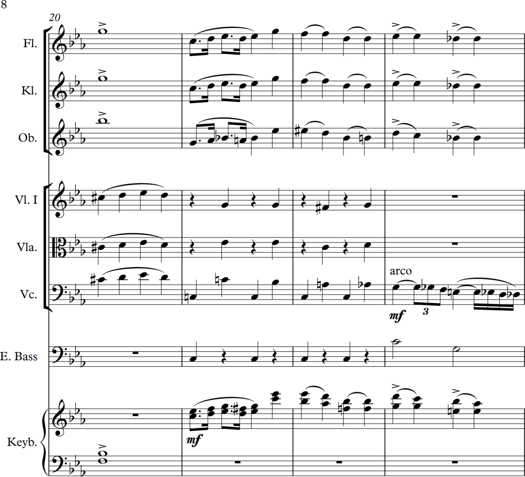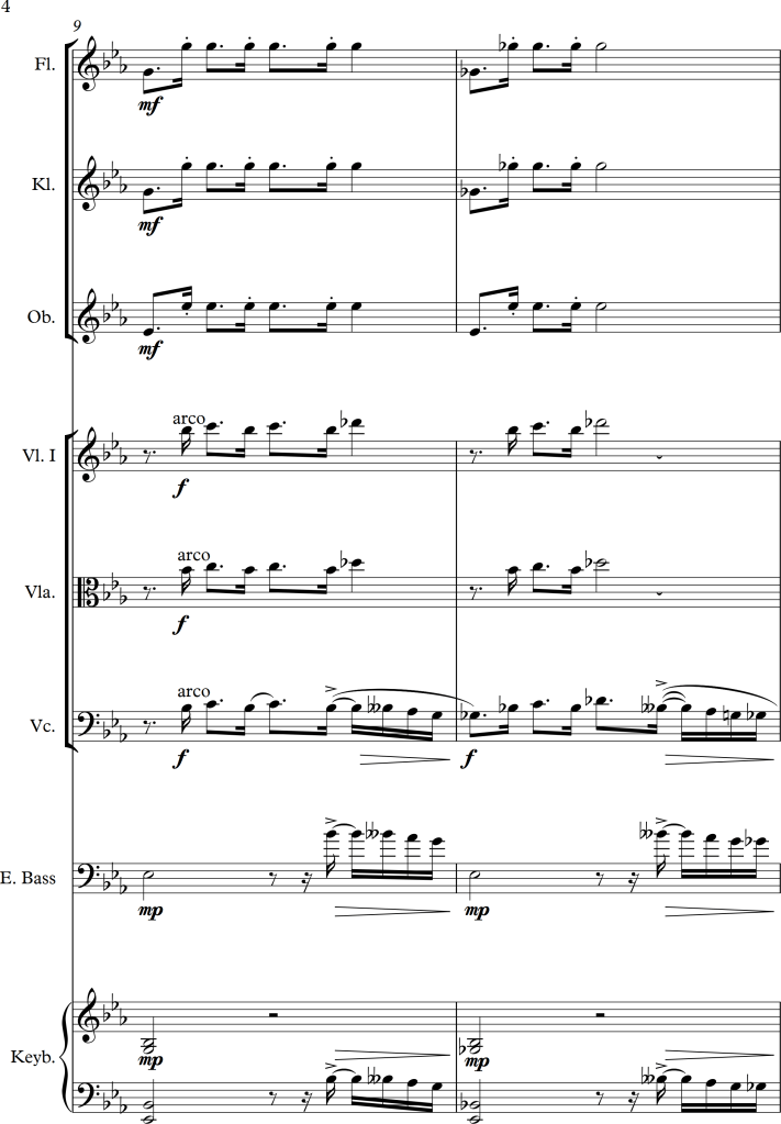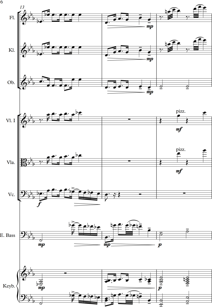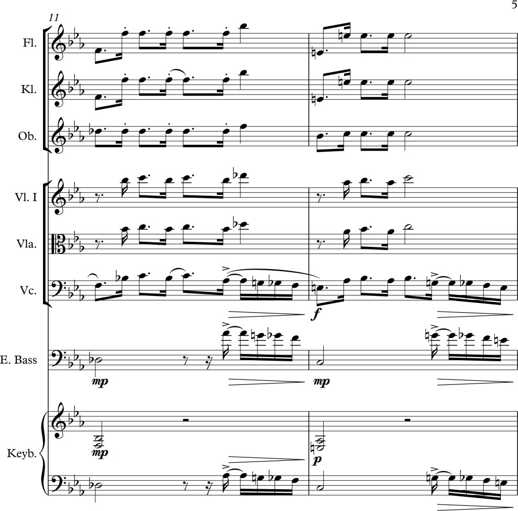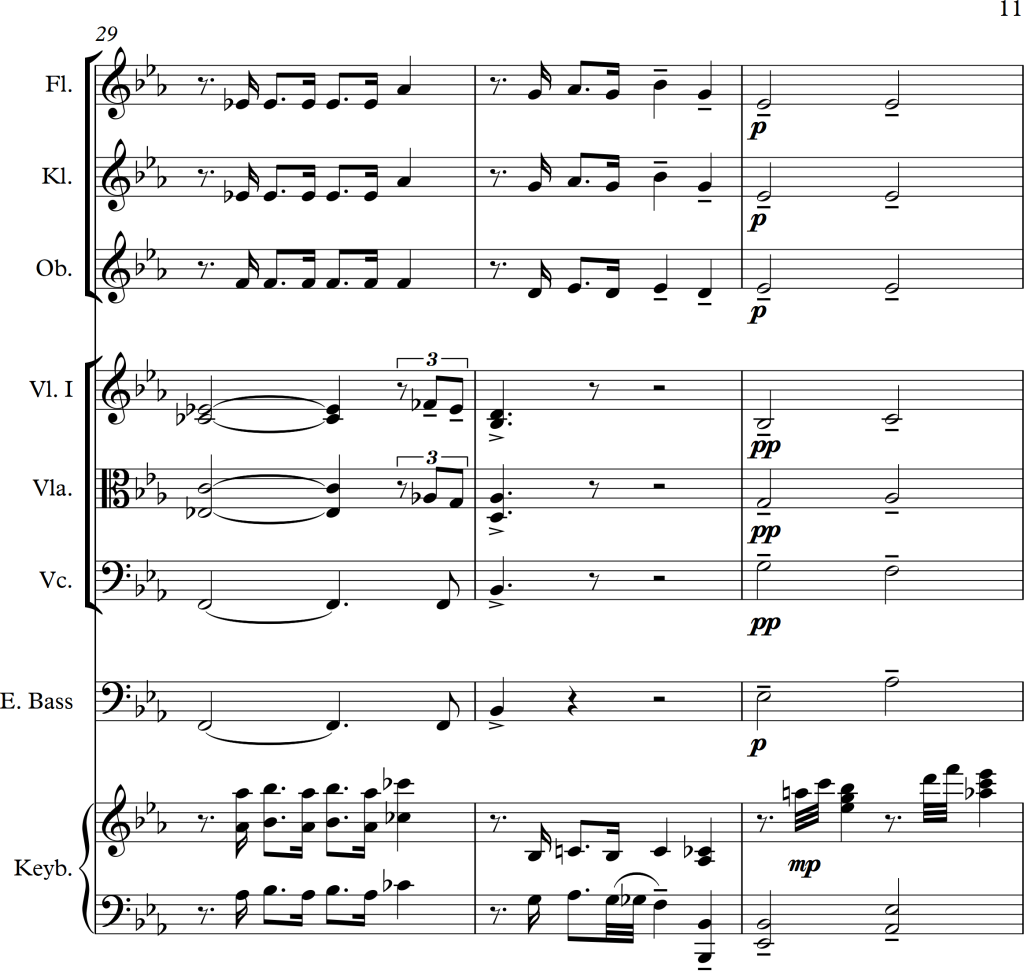 I wanted to combine the strings and woodwinds to play the melody, but as the piano version seemed much stronger, I decided to use the woodwinds alongside the keyboard and the strings as accompaniment. This also fitted much better to the bass line, for which I used the cello playing in pizzicato and the electric bass. As those two, alongside the left hand of the piano played either unison, in octaves or wide chords, there weren’t any problems with these low voices sounding too “muddy”.