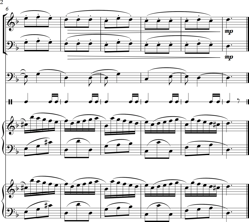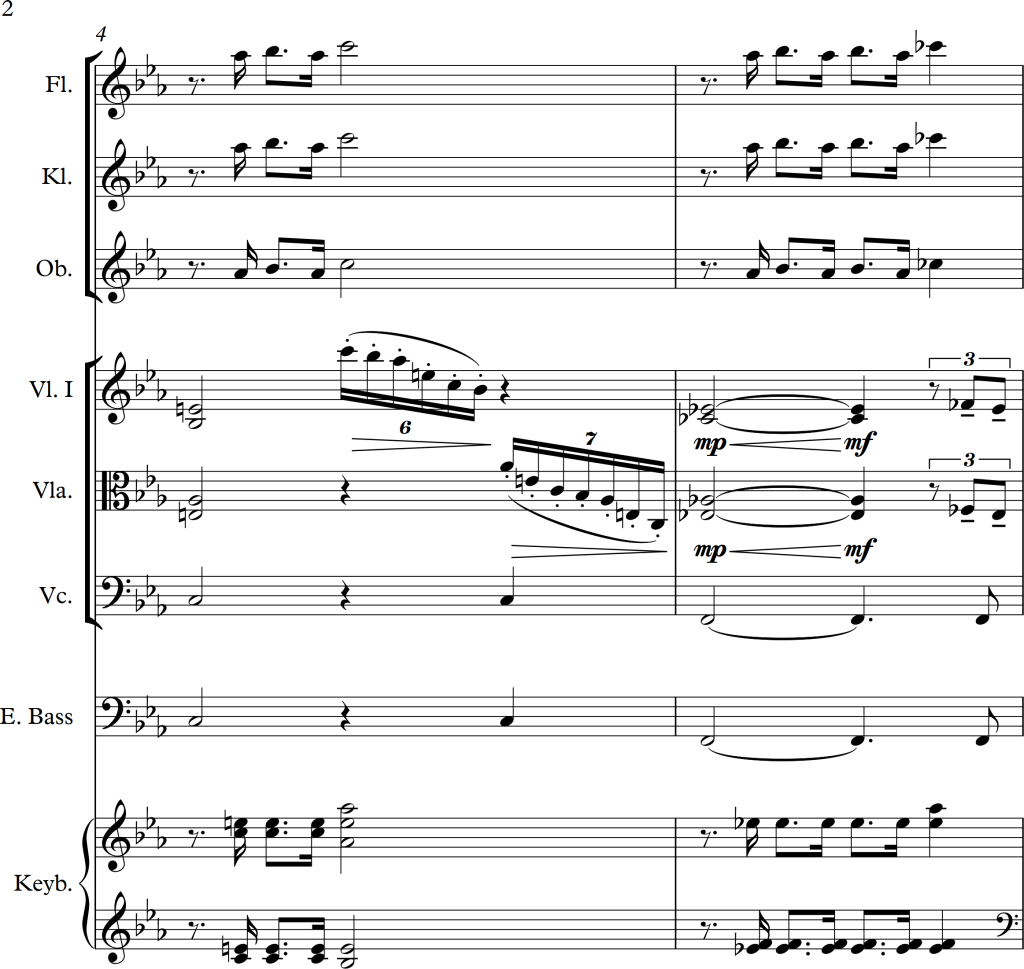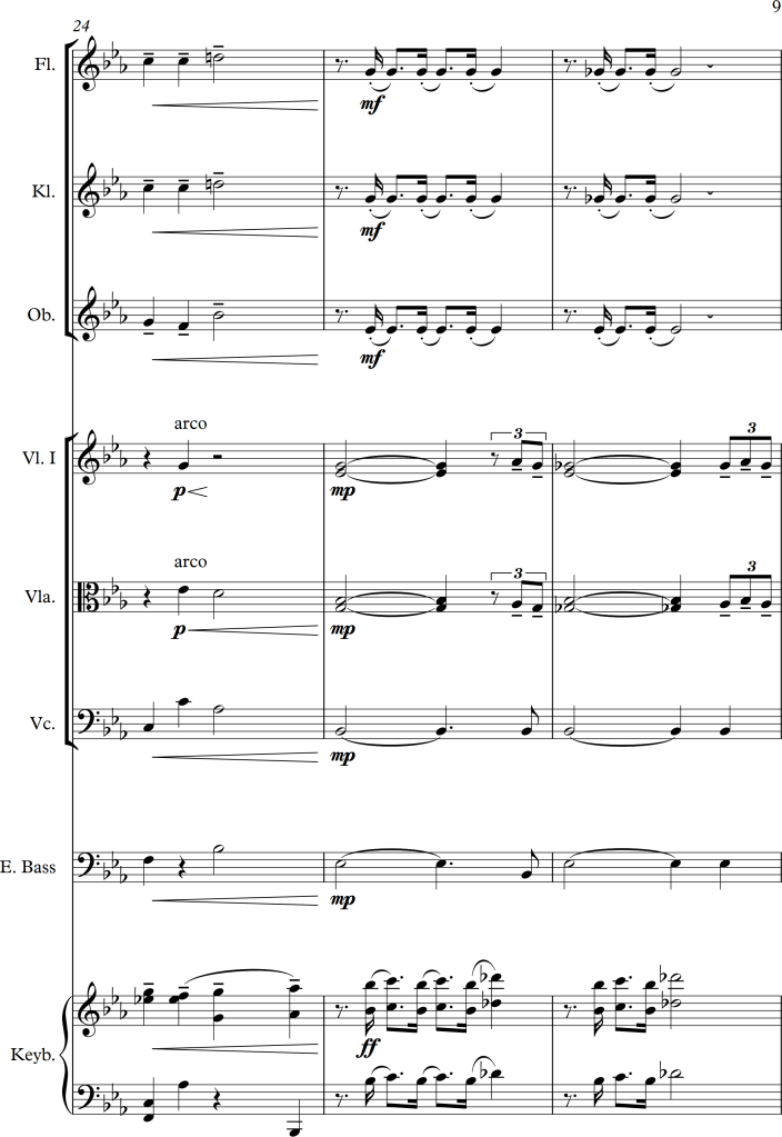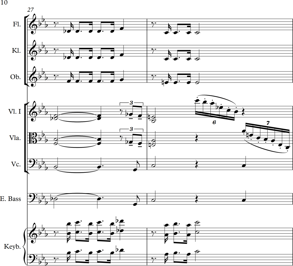 I wanted to combine the strings and woodwinds to play the melody, but as the piano version seemed much stronger, I decided to use the woodwinds alongside the keyboard and the strings as accompaniment. This also fitted much better to the bass line, for which I used the cello playing in pizzicato and the electric bass. As those two, alongside the left hand of the piano played either unison, in octaves or wide chords, there weren’t any problems with these low voices sounding too “muddy”.