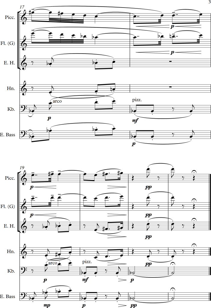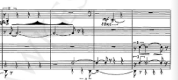 From bar 180 to around bar 200, Chin tries to imitate the sound of electronics by using mostly extended techniques for the natural instruments. At the end of the section, the sounds become more and more jittery and are almost impossible to tell apart from “real” electronic sounds.