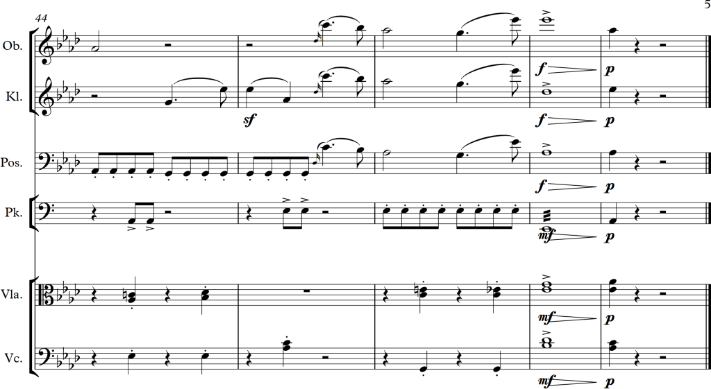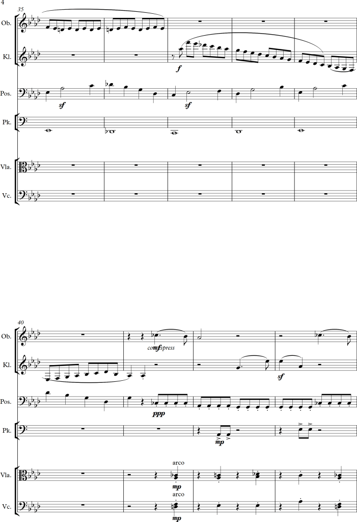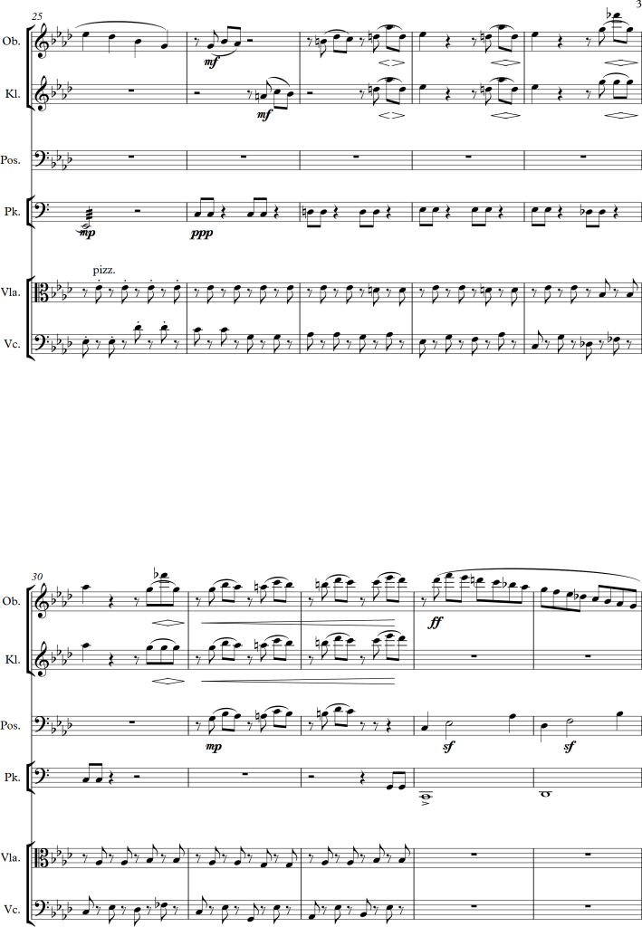 At bar 83, the time signature is changed from 5/4 to 3/4. To be honest, whilst only listening to the piece, I wouldn’t have noticed this change at all. Nonetheless, considering the instruments, one can notice, that instead of using the whole orchestra to produce swelling movements, the composer focused on using only small instrumental groups in an antiphonal arrangement, seemingly “talking” to one another.