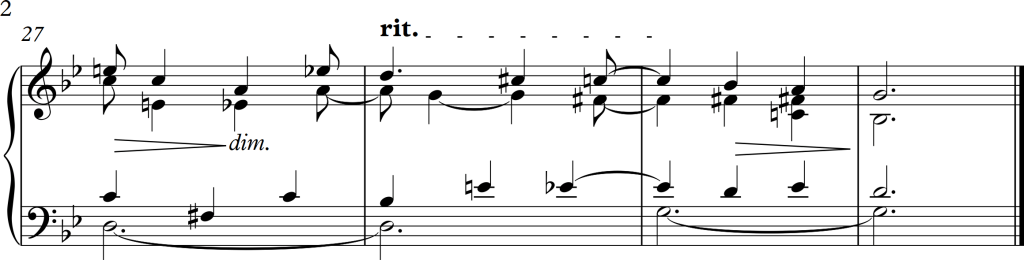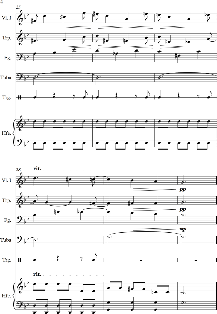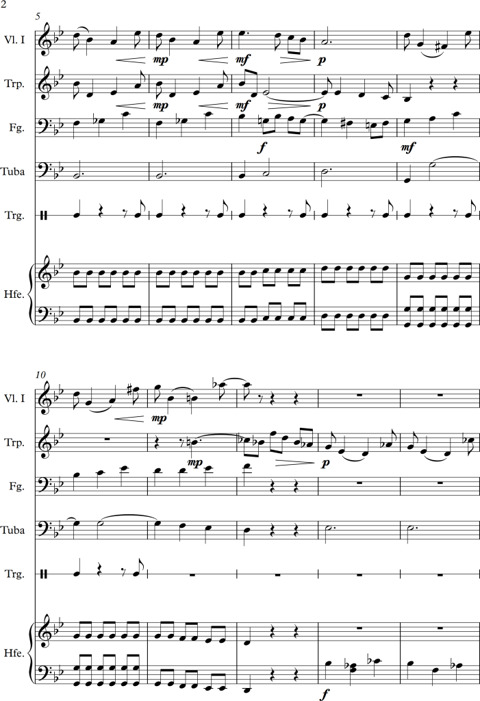 The first movement introduces several musical colours. The composer starts with a strong fanfare like theme in forte played unison by the lower brass section and strings. Without any transition, two more themes are introduced, not only played quieter but also with the use of different instruments. A song l, longing solo lead by a single violin and a harp can be heard. Over the course of the whole orchestral work, he seemed to have used almost every possible combination of instrumental groups, creating a high variety of warm, soft or darker, moodier themes. I personally couldn’t make out any consisting themes within the piece, it mostly consisted of different parts contrasting one another in musical colour and dynamics.Interestingly even if there are barely any transitioning parts between these themes, none of them come unexpectedly nor have a surprising effect.