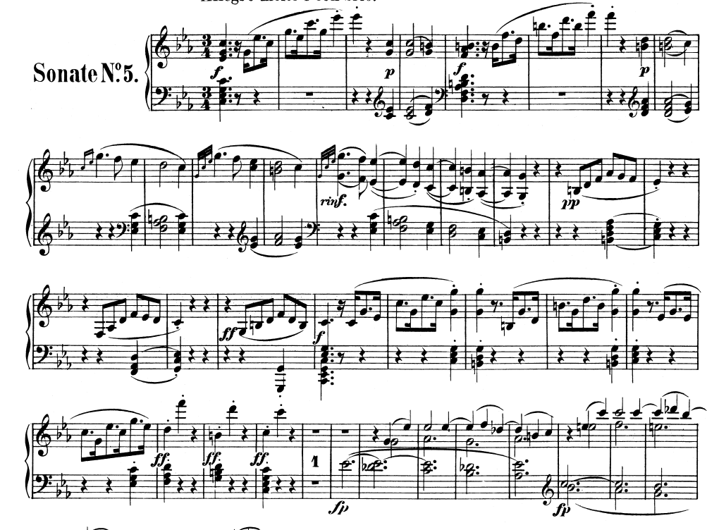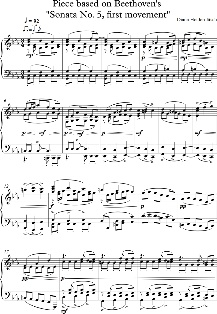 For the second part of this exercise, I had to choose a piece myself, which I should subtract to it’s harmonic “skeleton” and add my own ideas to it. My choice fell on the beginning of Beethoven’s 5th Sonata in C – minor, which has the following introducing bars: