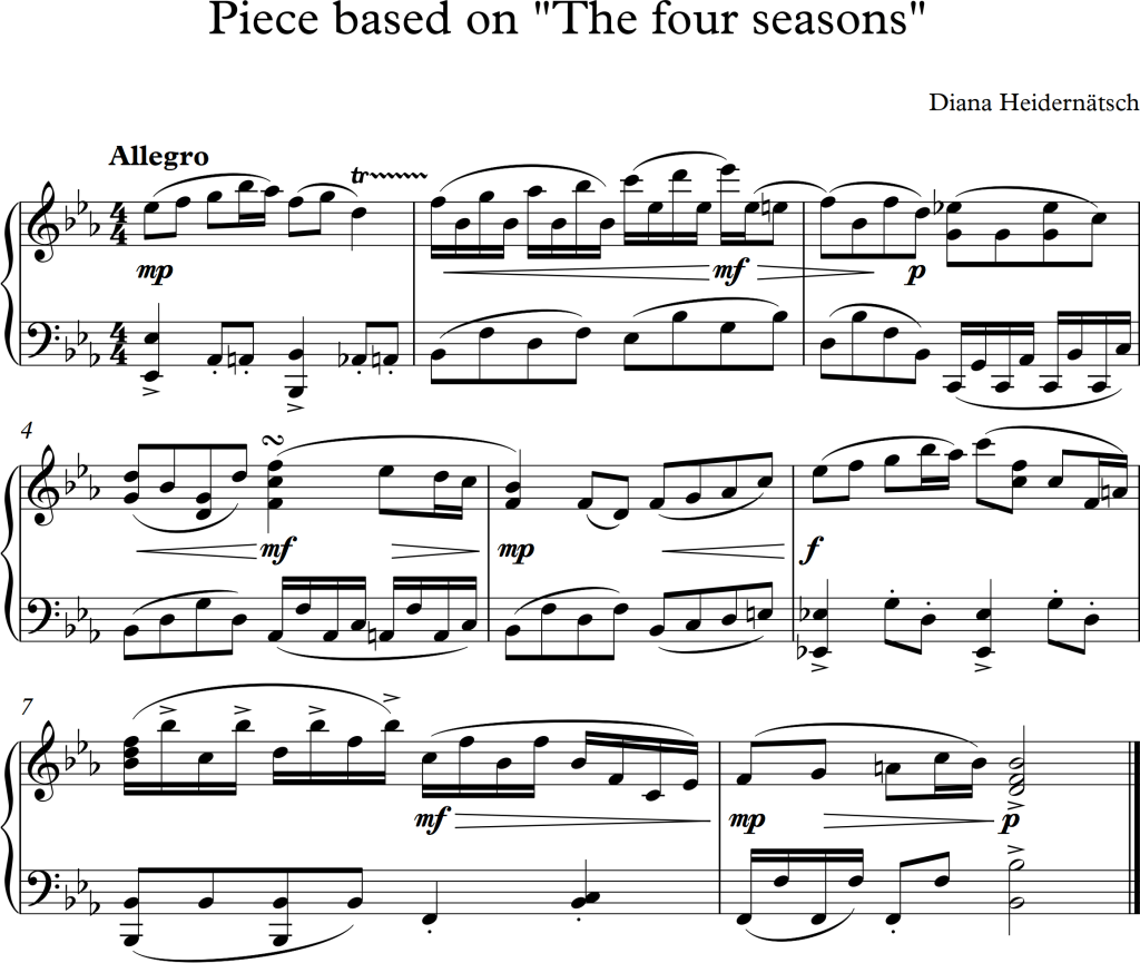 Within the first exercise, it was part of the task to move “far from Vivaldi”, even with the given skeleton of the piece, I often found myself moving back to features used in Classical music. Nonetheless, I personally think that the melodic line as well as the chord progression is still a huge step away from Vivaldi’s original version.