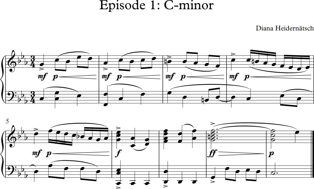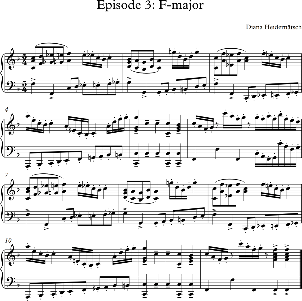 The task was to write 4 short contrasting episodes of chord progressions moving around the harmonic circle between I- pre V and- V, whereas the “pre V” could either be build from the IV, II or even III chord.