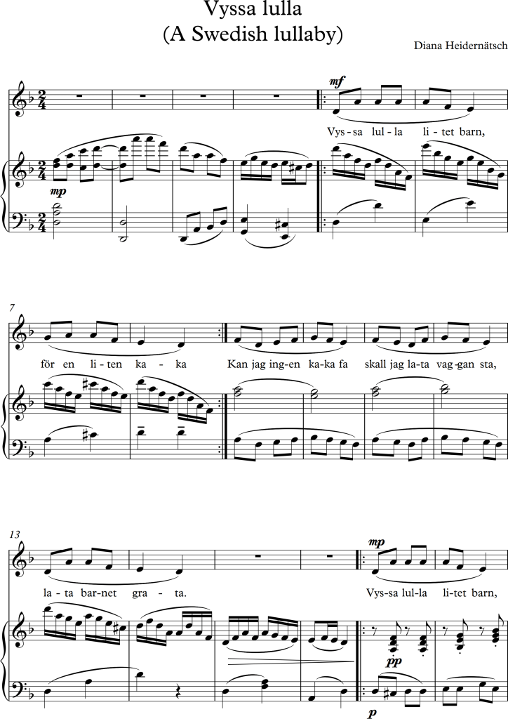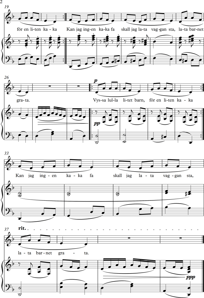 For this exercise, I chose one of the suggested songs from my study folder. I really liked the calming melody of the Swedish lullaby, and even though there’s only one verse, it is meant to be repeated several times, thus I tried adding different accompaniment textures to it.