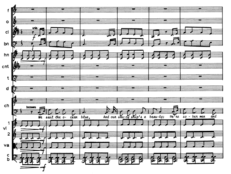 Above; The entry of the first song from Gilbert and Sullivan’s Operette Pinafore. The orchestra didn’t only accompany the choir, one can also see that the melody line is doubled in the clarinet and the bassoon. Nonetheless, the chorus is obviously still in the foreground.