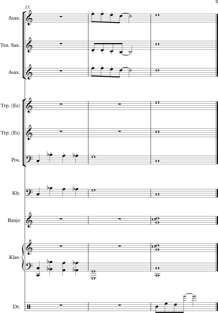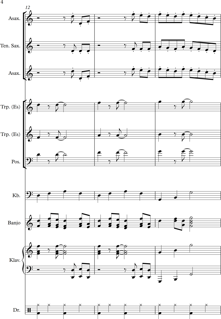 The task for this project was to write a short piece for a dance band, in the style of a fox-trot, charleston, tango or waltz often used in the 1920’s and 1930’s. I listened to several pieces (at least one per genre) in order to prepare for this task. The entries can be found in my Listening Log.