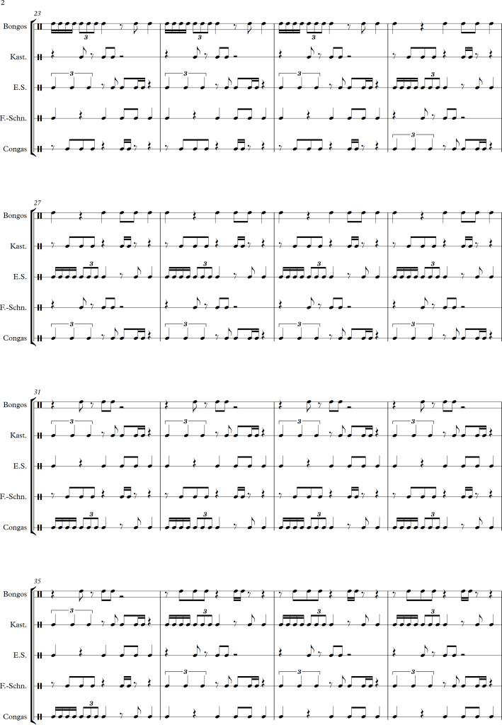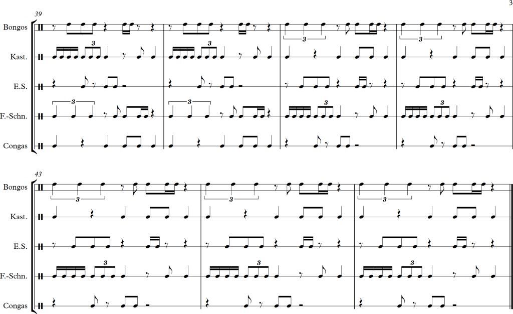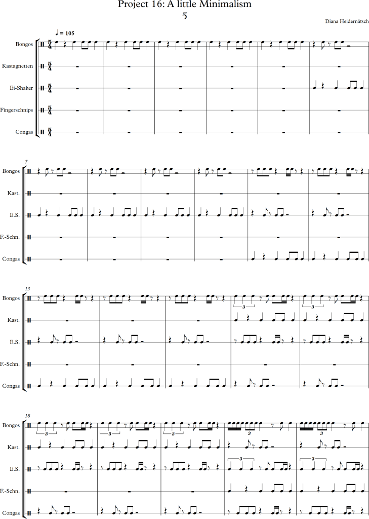 I was asked to create two contrasting pieces with repetitive effects. For the first one I used an idea suggested in the study folder, working with percussion instruments. I based the piece on the number “5”, using a 5/4 rhythm, as well as a repeating pattern, which are each five bars long. I only ended the piece once all instruments have played through all five different patterns at least once.