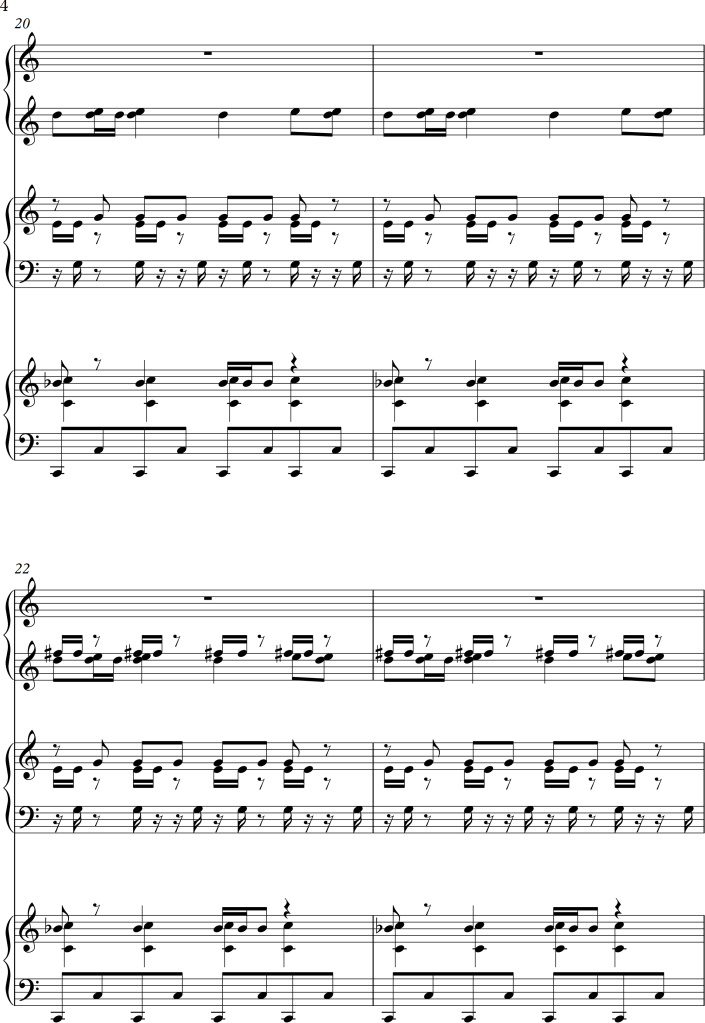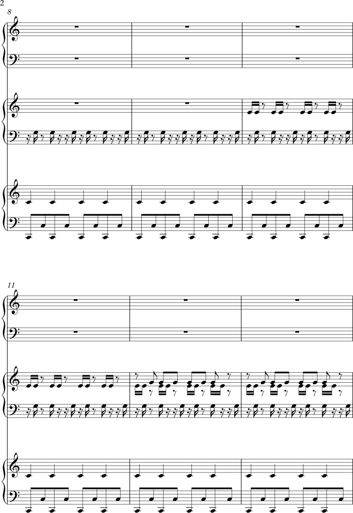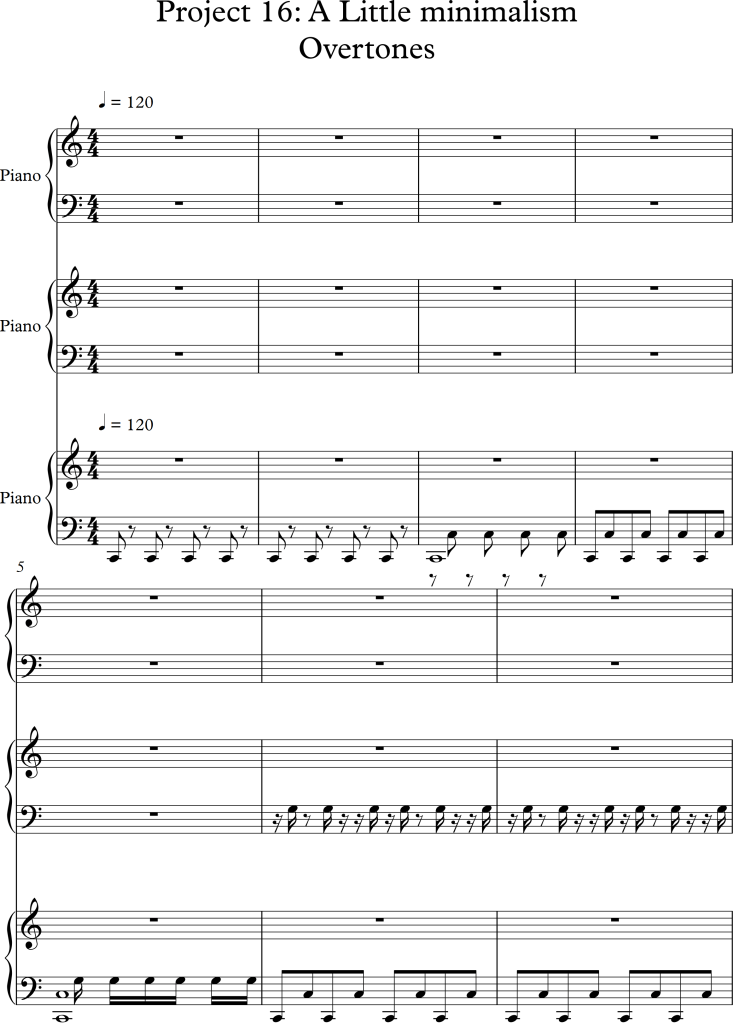 For the second piece, I wanted to use a more harmonical approach. I only used overtones of the note C, slowly adding up, all with a slightly different rhythmical pattern.