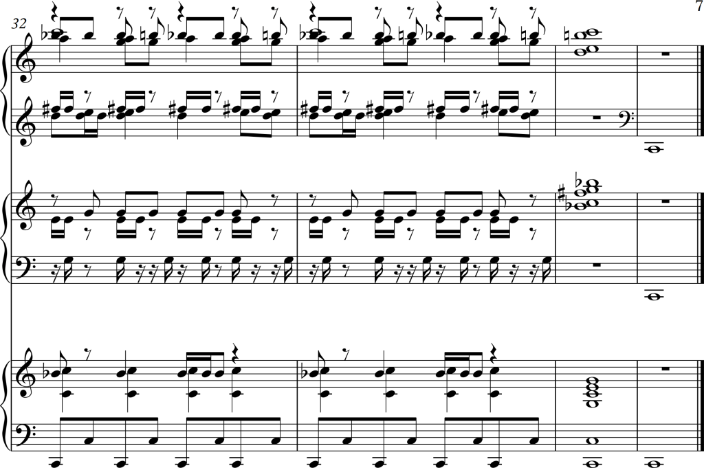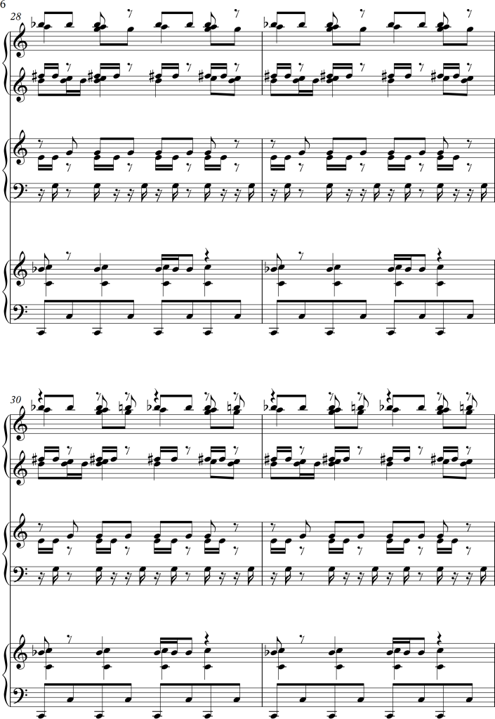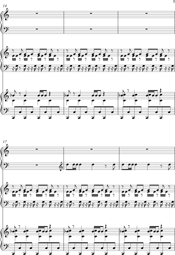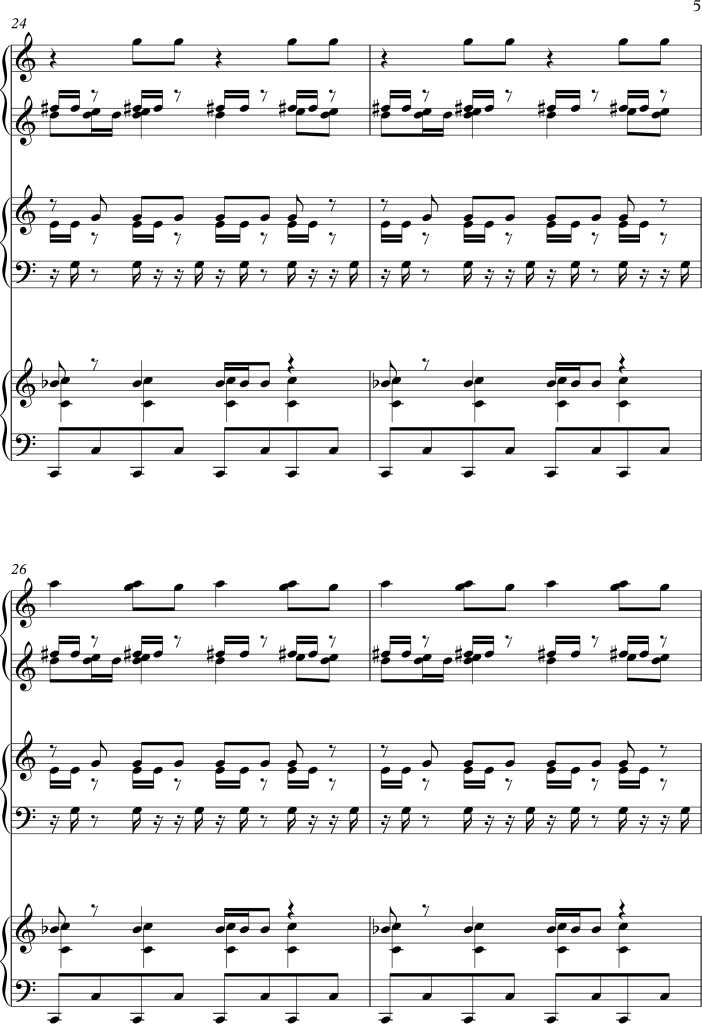 Even though two different keys were used for this piece (Bmajor in the right hand and G major in the left), it didn’t sound too disharmonic. Through the steady rhythm of a starting left hand motif, the melody seems to be floating. Interestingly, the right hand seems rhythmically mainly bound to the rhythmic pattern of the left hand. Some contrast is created by two types of melodies; a calmer one where the right hand only plays a single line, accompanied by the rhythmic pattern of the left hand and a more colourful one, where the right hand plays the rhythmic pattern in octaves and the left one the melody.