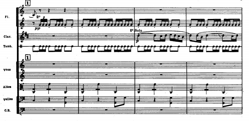 The first few bars before the first theme starts, one can only hear the snare, playing a clearly defined rhythm. The flute starts with the main theme, playing a solo. Due to the middle register, it has a warm and smoky sound, creating a warm and soft start for the piece. Not only the snare, but also the pizzicato strings create a strong sense of a forward – marching rhythm.