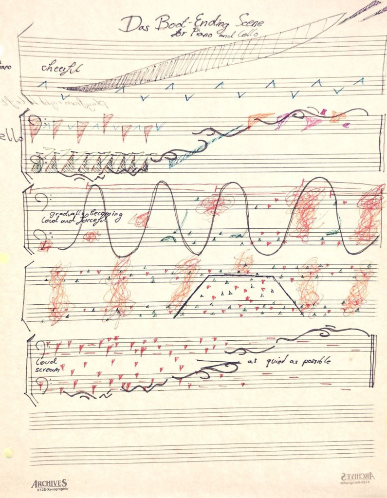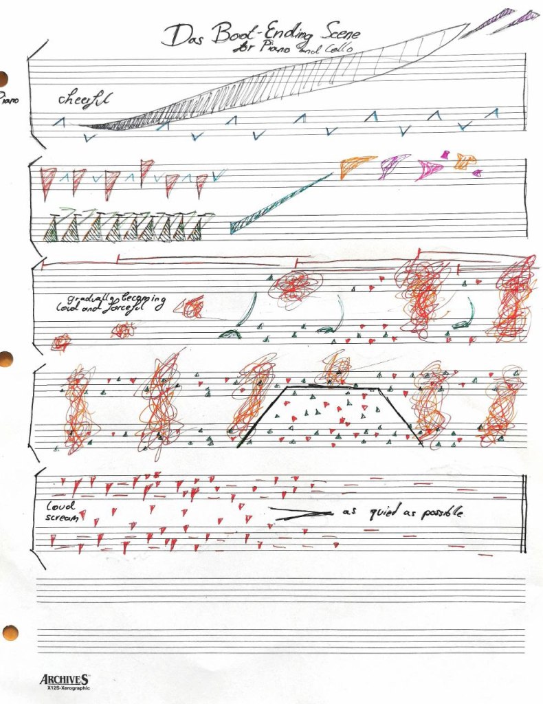 I initially didn’t find it easy at all to find a scene I thought was appropriate to write a graphic score to. I initially wanted to go for something funny, similar to “stripsody”, but changed my mind several times and ended up using the ending scene from “the boat” which can be seen below: